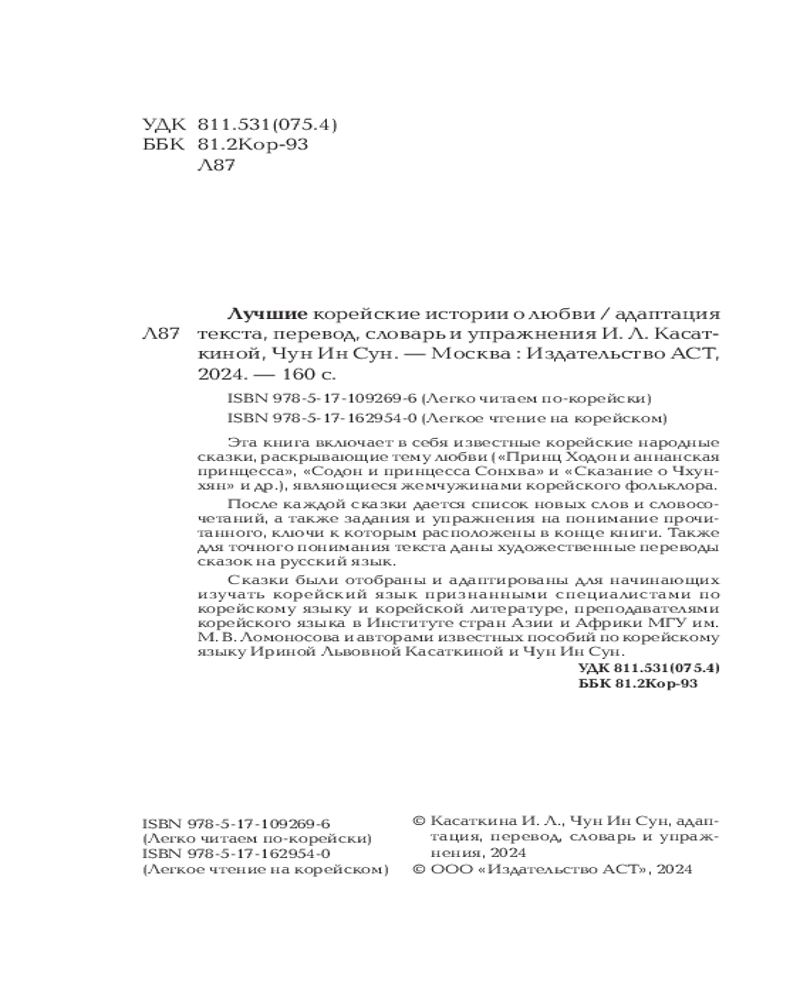 💳 Оплатить за товар можно при получении 🇰🇿 Есть бесплатная доставка по Казахстану от 1 дня 🎁 Копите бонусы с каждой покупки Серия: Легкое чтение на корейском Эта книга включает в себя известные корейские народные сказки, раскрывающие тему любви («Принц Ходон и аннанская принцесса», «Содон и принцесса Сонхва» и «Сказание о Чхунхян» и др.), являющиеся жемчужинами корейского фольклора. После каждой сказки дается список новых слов и словосочетаний, а также задания и упражнения на понимание прочитанного, ключи к которым расположены в конце книги. Также для точного понимания текста даны художественные переводы сказок на русский язык. Сказки были отобраны и адаптированы для начинающих изучать корейский язык признанными специалистами по корейскому языку и корейской литературе, преподавателями корейского языка в Институте стран Азии и Африки МГУ им. М. В. Ломоносова и авторами известных пособий по корейскому языку Ириной Львовной Касаткиной и Чун Ин Сун. |