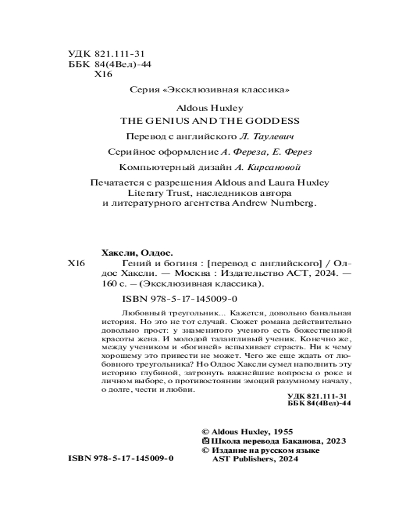 💳 Оплатить за товар можно при получении 🇰🇿 Есть бесплатная доставка по Казахстану от 1 дня 🎁 Копите бонусы с каждой покупки Серия: Эксклюзивная классика (Лучшее) Любовный треугольник... Кажется, довольно банальная история. Но это не тот случай. Сюжет романа действительно довольно прост: у знаменитого ученого есть божественной красоты жена. И молодой талантливый ученик. Конечно же, между учеником и «богиней» вспыхивает страсть. Ни к чему хорошему это привести не может. Чего же еще ждать от любовного треугольника? Но Олдос Хаксли сумел наполнить эту историю глубиной, затронуть важнейшие вопросы о роке и личном выборе, о противостоянии эмоций разумному началу, о долге, чести и любви. |