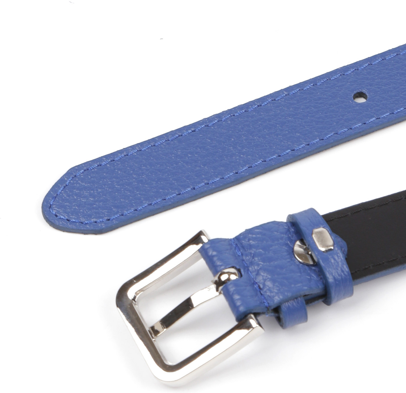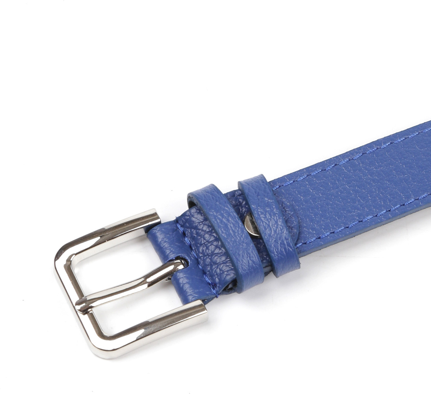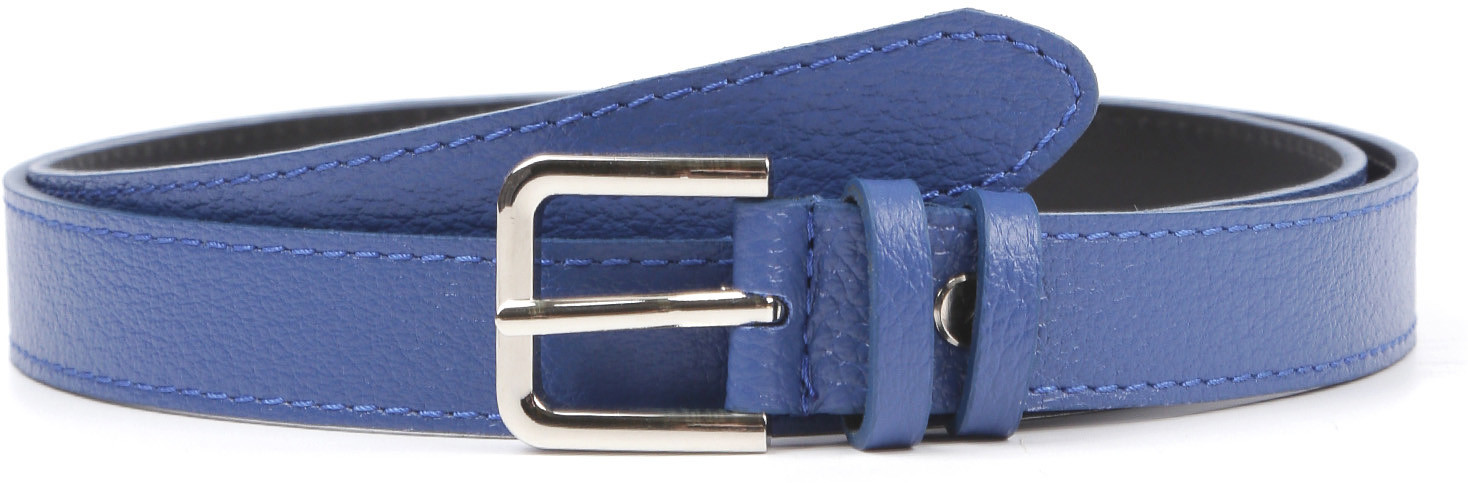Стильный ремень Fabretti в синем оттенке выполнен из мягкой зернистой кожи коровы и декорирован отстрочками — по одной с каждого края. Тыльная сторона — из гладкого плотного спила. Модель дополнена прямоугольной пряжкой из прочного гальванического сплава с покрытием — серебро. Пряжка крепится к изделию с помощью винта, что позволяет легко отрегулировать длину. Две шлевки из зернистой кожи в тон изделию: одна закреплена, вторая — подвижная.