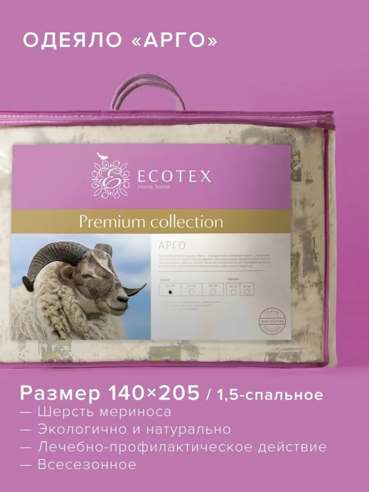 Одеяла «Арго» в 100% хлопковой ткани перкале, из овечьей шерсти породы меринос торговой марки Ecotex изготавливаются на собственной высокотехнологичной фабрике с соблюдением контроля качества изделия и материалов. Уникальные свойства шерсти делают одеяла коллекции «Арго» популярными среди покупателей.