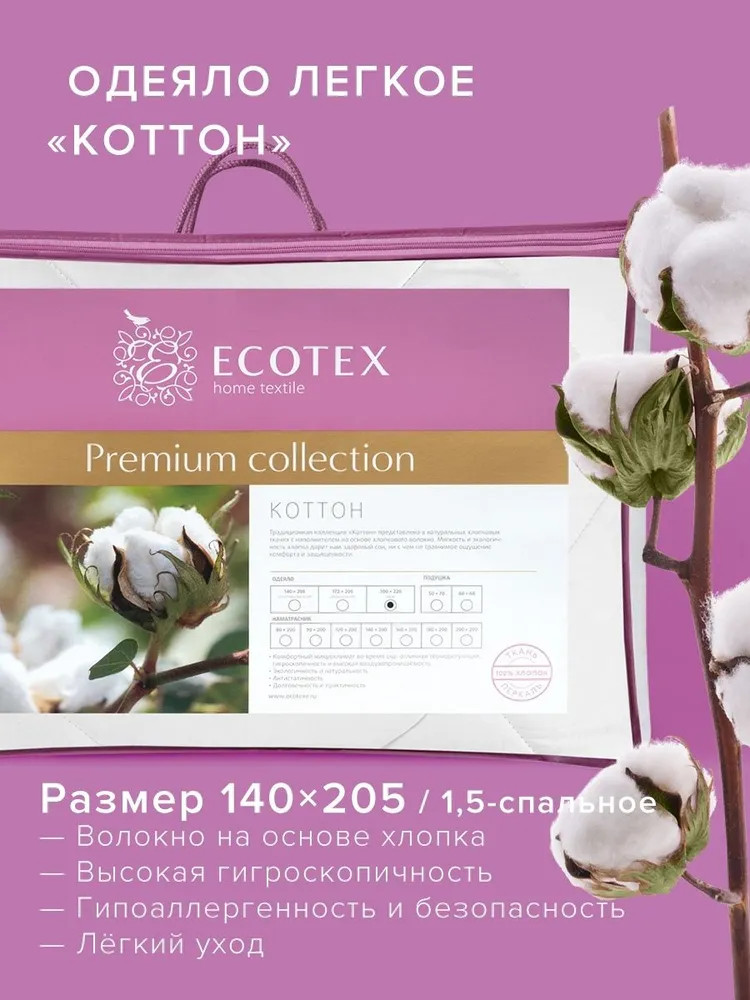 Качественное хлопковое одеяло коллекции «Коттон» — настоящая находка для тех, чья нежная кожа требует особой заботы. Подлинная ценность одеяла — в комфорте, которым оно окружает Вас всю ночь. Мы хотим, чтобы каждую ночь, укрываясь одеялом от Ecotex, Вы получали настоящее удовольствие. Традиционная коллекция одеял «Коттон» представлена в натуральных хлопковых тканях с наполнителем на основе хлопкового волокна. Мягкость и экологичность хлопка дарит нам здоровый сон, ни с чем не сравнимое ощущение комфорта и защищенности.