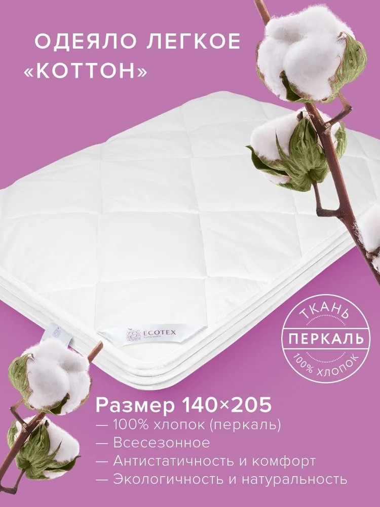 Одеяло с натуральным наполнителем лучше удерживает тепло, оно легкое, поддерживает комфортный микроклимат во время сна, антистатично, долговечно и практично. Сама природа заботится о Вашем комфорте и здоровье. Облегченное хлопковое одеяло «Коттон» в 100% хлопковой ткани отличается от своих «зимних» собратьев — одеял классических — плотностью наполнителя. Это прекрасный выбор для тех, кто любит оптимальную температуру круглый год. Под таким одеялом не жарко летом, а зимой тепло и комфортно.