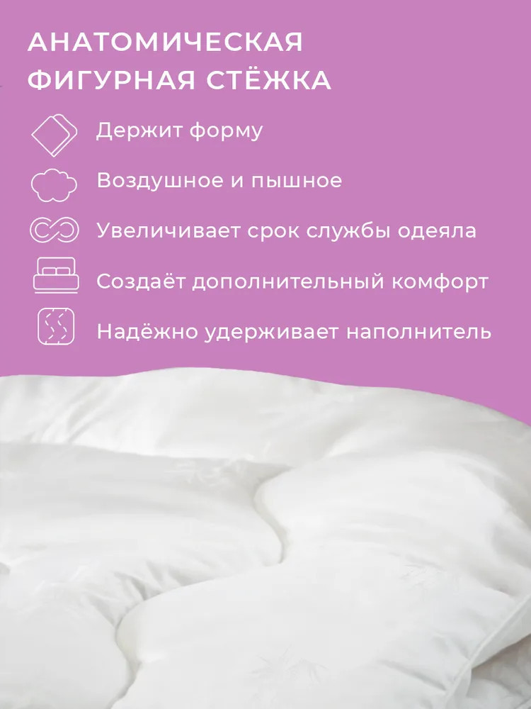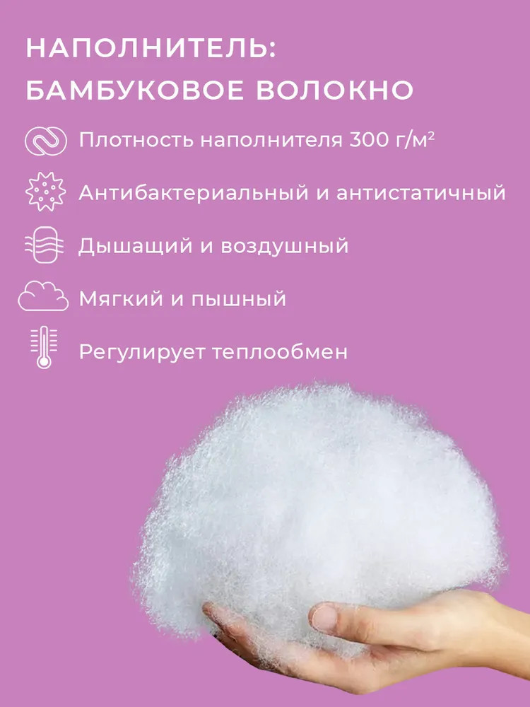 Погрузитесь в мир спокойствия и комфорта с нашим уникальным одеялом. Одеяло, которое превратит вашу спальню в источник уюта и релаксации. Наше одеяло имеет особый наполнитель, созданный из волокна на основе бамбука. Этот инновационный материал обеспечивает удивительно мягкое и шелковистое ощущение на коже. Он также обладает естественной влагоотводящей способностью, помогая поддерживать комфортный микроклимат во время сна. С плотностью наполнителя 300 г/м², наше одеяло предлагает идеальное сочетание пушистости и поддержки.
