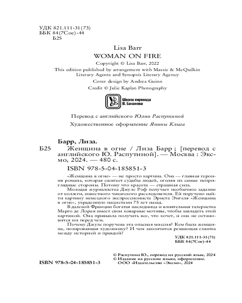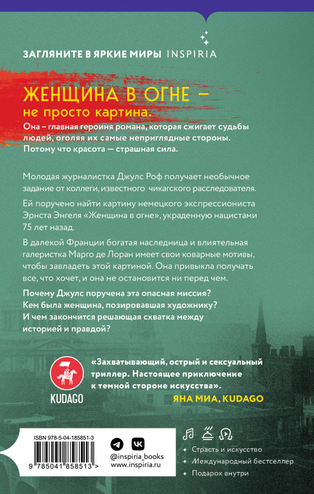 💳 Оплатить за товар можно при получении 🇰🇿 Есть бесплатная доставка по Казахстану от 1 дня 🎁 Копите бонусы с каждой покупки Серия: Novel. Страсть и искусство Молодая журналистка Джулс Роф получает необычное задание от коллеги, известного чикагского расследователя. Ей поручено найти картину немецкого экспрессиониста Эрнста Энгеля «Женщина в огне», украденную нацистами 75 лет назад. В далекой Франции богатая наследница и влиятельная галеристка Марго де Лоран имеет свои коварные мотивы, чтобы завладеть этой картиной. Она привыкла получать все, что хочет, и она не остановится ни перед чем. Почему Джулс поручена эта опасная миссия? Кем была женщина, позировавшая художнику? И чем закончится решающая схватка между историей и правдой? |