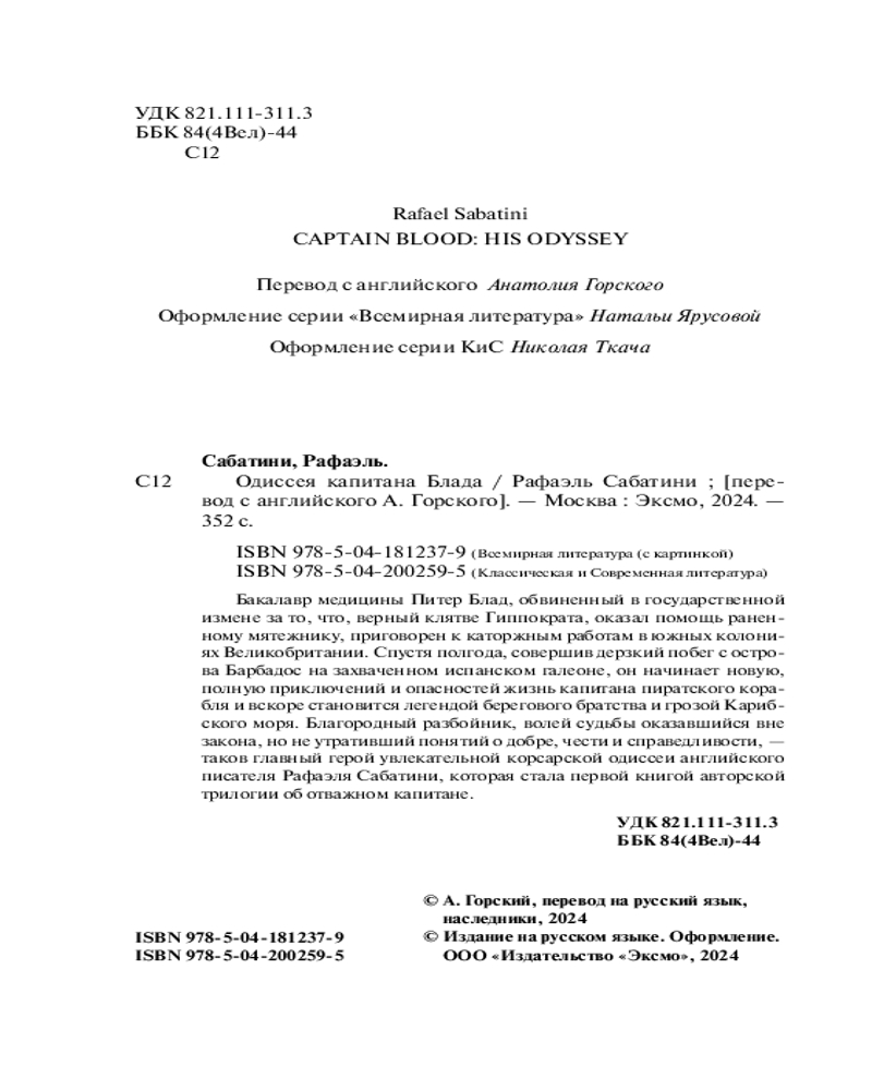 💳 Оплатить за товар можно при получении 🇰🇿 Есть бесплатная доставка по Казахстану от 1 дня 🎁 Копите бонусы с каждой покупки Серия: Всемирная литература (новое оформление) Бакалавр медицины Питер Блад, обвиненный в государственной измене за то, что, верный клятве Гиппократа, оказал помощь раненному мятежнику, приговорен к каторжным работам в южных колониях Великобритании. Спустя полгода, совершив дерзкий побег с острова Барбадос на захваченном испанском галеоне, он начинает новую, полную приключений и опасностей жизнь капитана пиратского корабля и вскоре становится легендой берегового братства и грозой Карибского моря. |