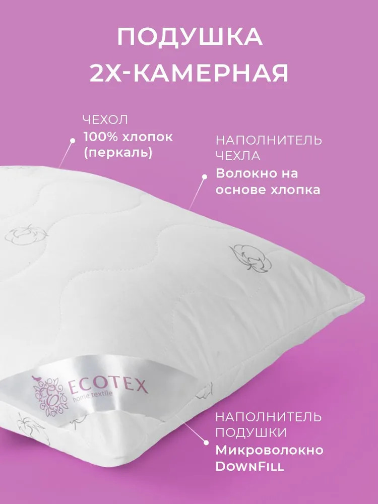 Анатомическая стежка чехла подушки значительно увеличивает срок службы изделия и создает дополнительный комфорт. Остальной объём подушки занимает высокосиликонизированное микроволокно DownFill, называемое «синтетическим лебяжьим пухом» — волокном нового поколения. Такая комбинация позволяет изделию сохранить все достоинства природного материала, не давая ему деформироваться в процессе эксплуатации. Мягкость и экологичность хлопка дарит нам здоровый сон, ни с чем не сравнимое ощущение комфорта и защищенности.