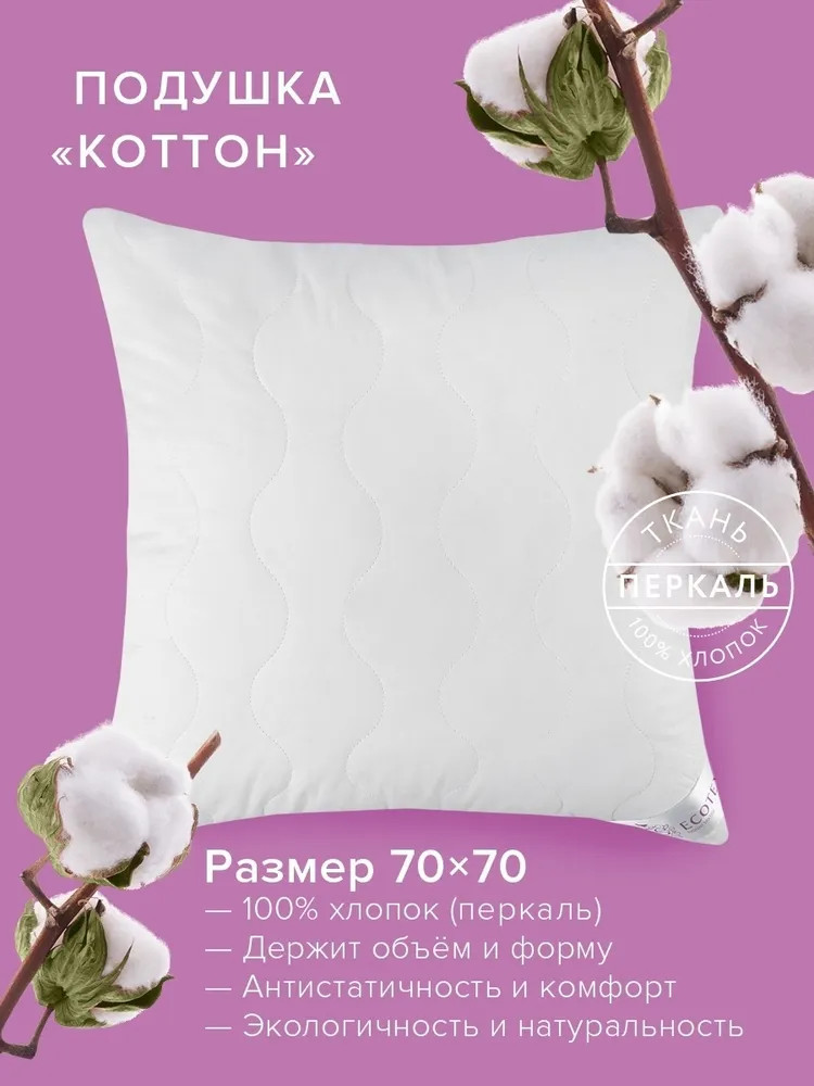Ищите подушку, на которой даже в жару сон будет сладким и безмятежным? Легкие, воздушные, натуральные подушки из хлопкового волокна в 100% в хлопковой ткани перкаль — лучший выбор для комфортного сна. Особенность модели подушки коллекции «Коттон»: чехол из 100% хлопковой ткани перкаль и наполнитель из хлопкового волокна. Перкаль — высококачественная хлопчатобумажная ткань полотняного переплетения, вырабатываемая из тонкой крученой пряжи, отличается исключительным качеством, гигиеничностью и высокой прочностью, что делает эту ткань наиболее популярным материалом для изготовления постельного белья и чехлов для одеял и подушек. Перкаль надежно удерживает наполнитель внутри изделия.