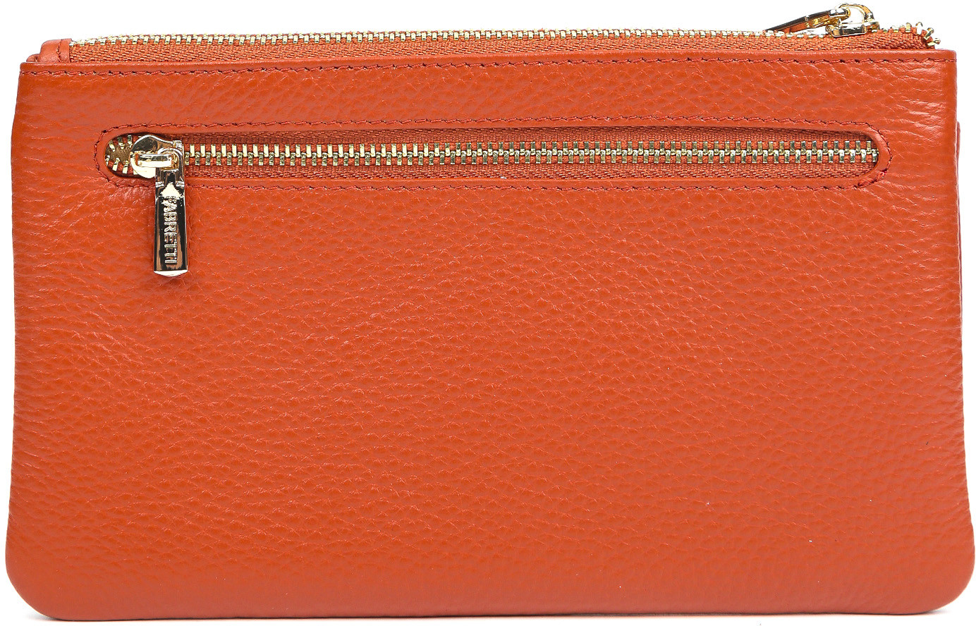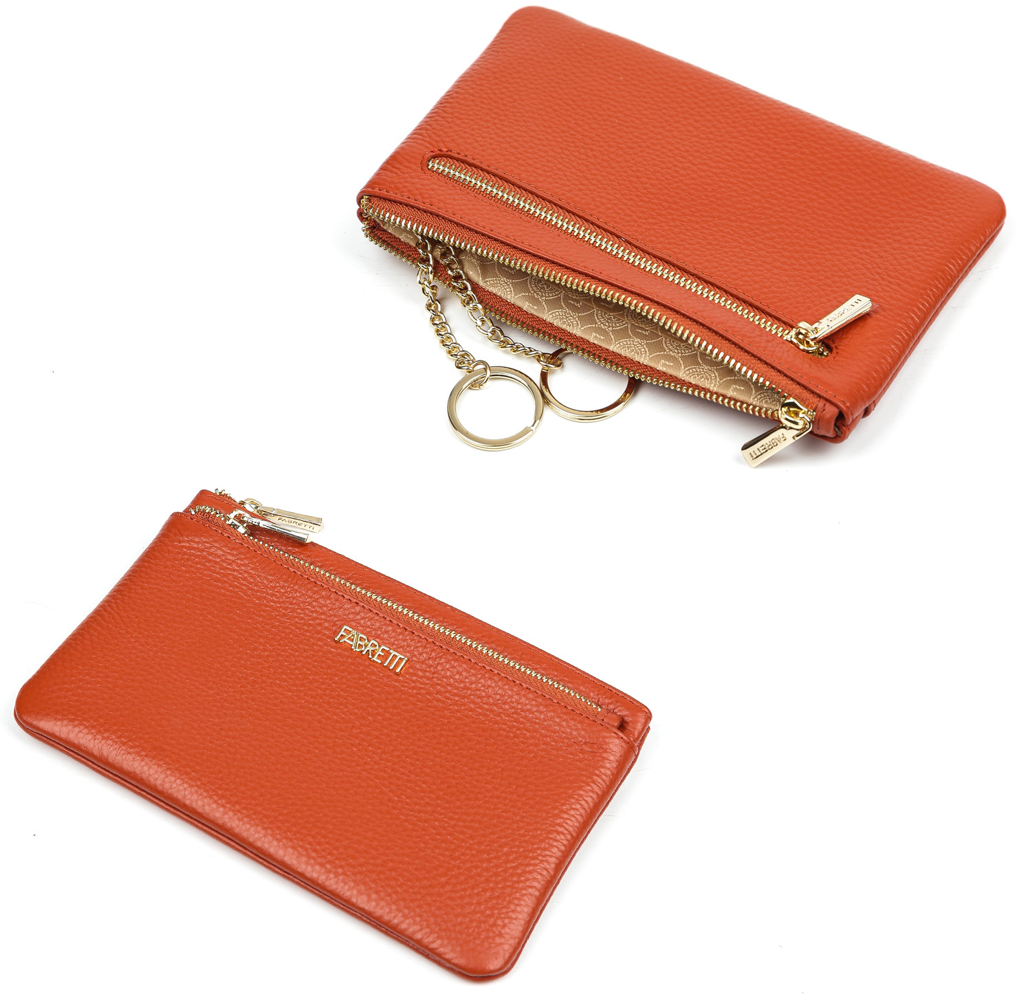 Вместительный кошелек-ключница выполнен из натуральной зернистой кожи в оранжевом оттенке и может выполнять функции косметички. В аксессуаре одно отделение для ключей с двумя кольцами-держателями на цепочке и боковым карманом для банковских карт. На лицевой стороне — вместительный карман на молнии для купюр и разных мелочей. На тыльной стороне также предусмотрен вместительный карман на молнии. Фурнитура под золото гармонично дополняет дизайн изделия.
