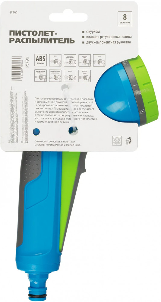 Регулируемый пистолет-распылитель Palisad LUXE с курком и 8 режимами работы подключается к любым поливочным системам ТМ Palisad и Palisad Luxe для ручного орошения растений на участке, в сквере или парке, а также мытья дорожек и садовых принадлежностей. 8 режимов распыления позволяют выбрать необходимый тип струи для полива различных растений. Пистолет будет полезен садоводам и сотрудникам коммунальных служб.