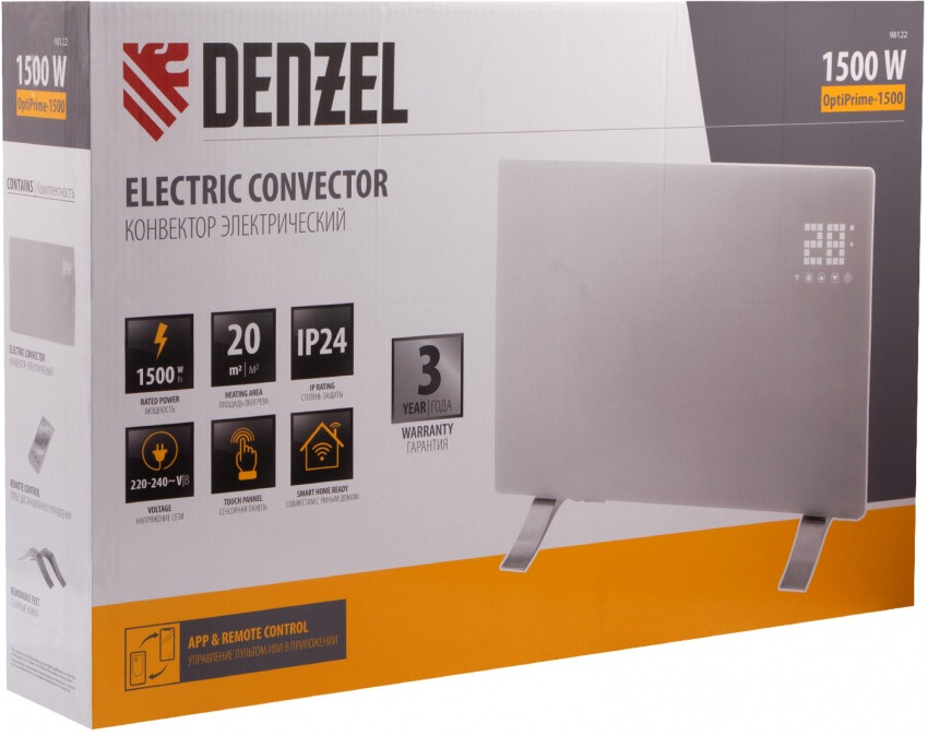 Электрический конвектор Denzel OptiPrime-1500 максимальной мощностью 1500 Вт, с тачскрином, цифровым термостатом и функцией подключения к Wi-Fi, рассчитан на обогрев квартиры, дачи, загородного дома, офиса, а также пригодится в производственных, бытовых и общественных помещениях. Рекомендуемая площадь обогрева — 20 кв.м. Две мощности обогрева 750 и 1500 Вт позволяют поддерживать температуру в отапливаемой комнате и полностью прогревать холодные помещения.