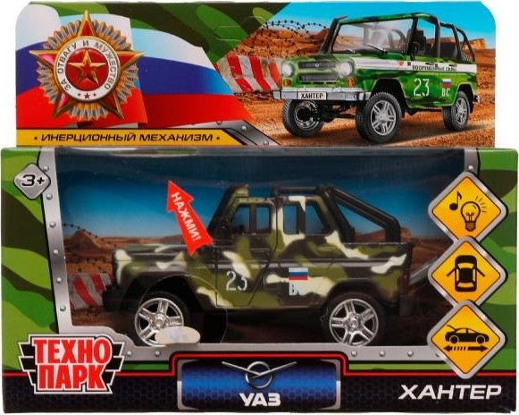Металлическая модель «УАЗ Hunter» ТМ «Технопарк» - прекрасный подарок для ребёнка. Металлическая модель, выполненная с учётом всех особенностей прототипа, обязательно понравится вашему ребёнку. Благодаря открывающимся дверям, которые делают машинку максимально похожей на настоящую, всегда можно заглянуть к ней внутрь, чтобы убедиться - каждая деталь отлично проработана. Реалистичный дизайн данной модели позволит с головой погрузиться в игру, придумывая новые интересные сюжеты. Кроме того, эта игрушка познакомит малыша с марками автомобилей и видами военной техники. |