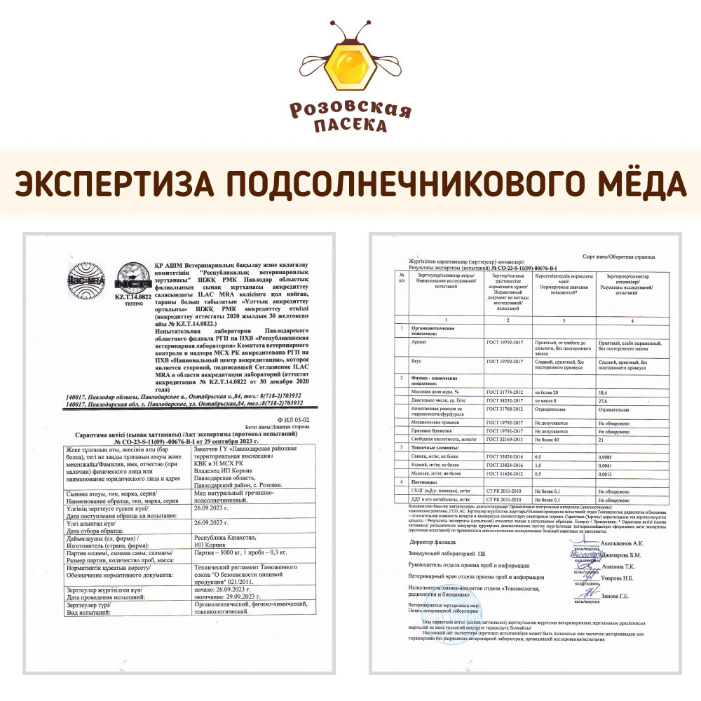 Вкусный мед. Произведен в Павлодарской обл , с Розовка. Ведерко упаковано, продукт имеет штрихкод, значит прошел процедуру регистрации. Указан производитель, дата фасовки, тел производителя и адрес www. Есть защитный тикер. Сам мед уплотненной структуры, но мне нравится такой, можно ножом нарезать. Терпкий, зернистый со вкусом подсолнечника. Но вкус отличается от меда, например, оренбурского, башкирского. Те, мягче. Мед рекомендую, вкусный. Магазину спасибо за доставку продукта