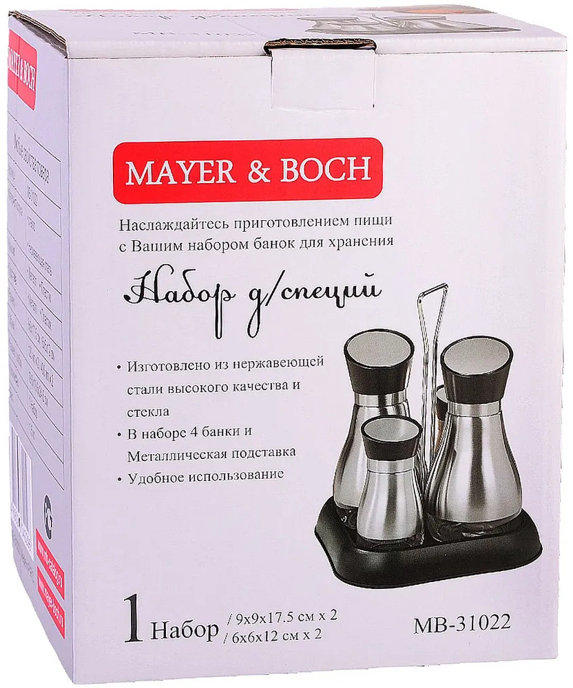 💳 Оплатить за товар можно при получении 🇰🇿 Есть бесплатная доставка по Казахстану от 1 дня 🎁 Копите бонусы с каждой покупки Набор для специй Mayer & Boch — это отличное решение, позволяющее удобно использовать специи и приправы во время приготовления или приема пищи. Корпус изделий оригинально смоделирован, отличается красивым дизайном, выполнен из нержавеющей стали и стекла, а это значит баночки прослужат очень долго. Дно банки прозрачное, что позволяет видеть количество приправ и их разновидность, поэтому вы никогда не ошибетесь с выбором. Крышки плотно закрываются и препятствуют проникновению влаги и посторонних запахов внутрь, а отверстия в ней позволяют оптимально дозировать приправы по вкусу. Емкости для специй красиво размещаются на удобной подставке с ручкой, благодаря которой их удобно хранить и переставлять, не занимает много места выглядят стильно и практично. Контейнеры делают процесс готовки более легким и приятным, а кухня будет выглядеть более аккуратной и организованной. Комплект надежно упакован в индивидуальную коробку. Выберите подарочный набор для своих близких и друзей и подарите им мечту об удобстве и комфорте в приготовлении вкусной еды. |