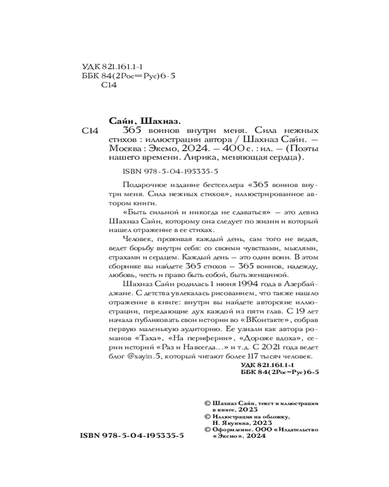 💳 Оплатить за товар можно при получении 🇰🇿 Есть бесплатная доставка по Казахстану от 1 дня 🎁 Копите бонусы с каждой покупки Серия: Поэты нашего времени. Лирика, меняющая сердца Уникальное и очень личное издание бестселлера «365 воинов внутри меня». Шахназ украсила его своими иллюстрациями и добавила небольшие вдохновляющие послания читателям. Все подписи и рисунки были сделаны автором вручную и бережно перенесены дизайнером на страницы книги. |