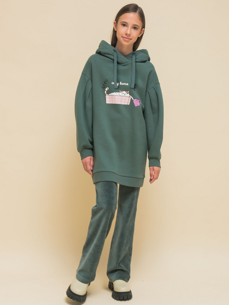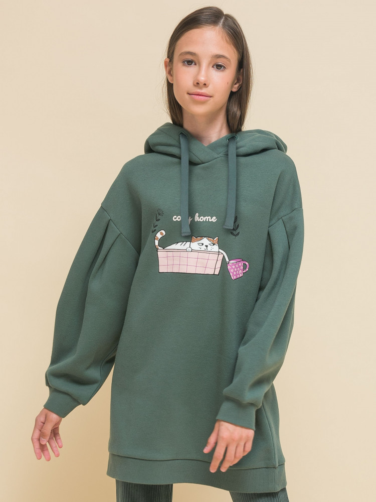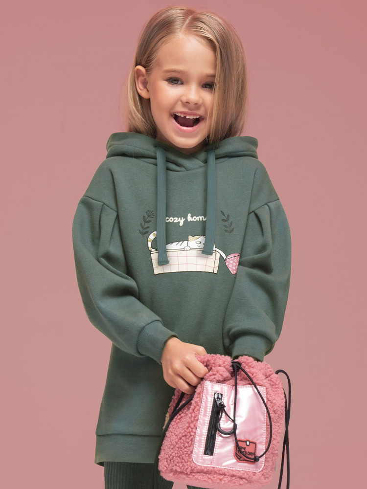 Худи оверсайз с принтом на груди. Принт эластичный и прочный, без проблем переносит частые стирки. Милый принт изображает котика в корзине с чашкой, надпись переводится: «уютный дом». Худи для девочек неприхотливо в уходе. В составе ткани преобладает высококачественный хлопок — толстовка мягкая и прекрасно пропускает воздух, давая коже ребёнка дышать. Благодаря полиэстеру изделие легко стирается и быстро сохнет, сохраняет первозданную форму надолго. Туника представлена в двух трендовых цветах: красный и зелёный (оттенок хаки).