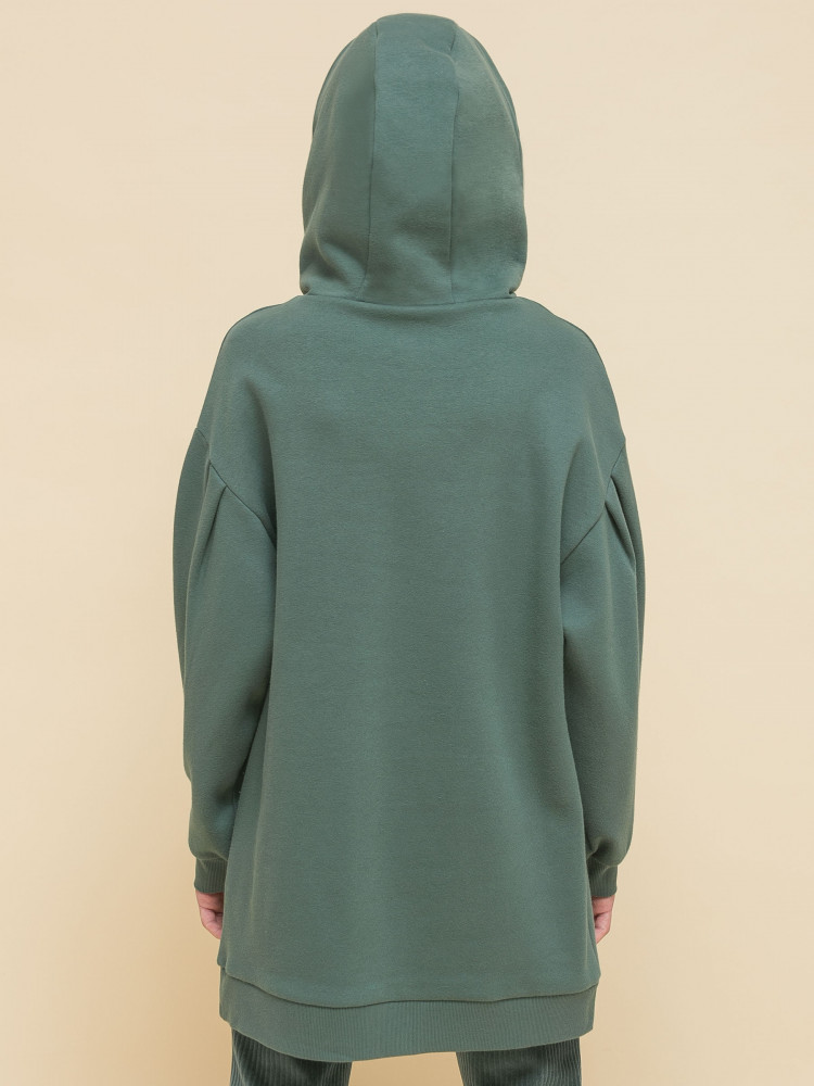 Худи детское удлиненное для девочки. Туника актуального оверсайз-силуэта со спущенным плечом подарит ребёнку комфорт и свободу движения. На рукавах красивые глубокие складки. Объёмные рукава — один из модных трендов сезона. По низу изделия и низу рукавов манжеты из эластичной рибаны (ткань в рубчик), они не растягиваются и сохраняют форму и отличный внешний вид надолго. Капюшон с двумя швами, что обеспечивает анатомически правильную форму и комфортную посадку по голове. Объём капюшона регулируется тесьмой, продетой в крупные люверсы. Капюшон двойной — швы не видно.