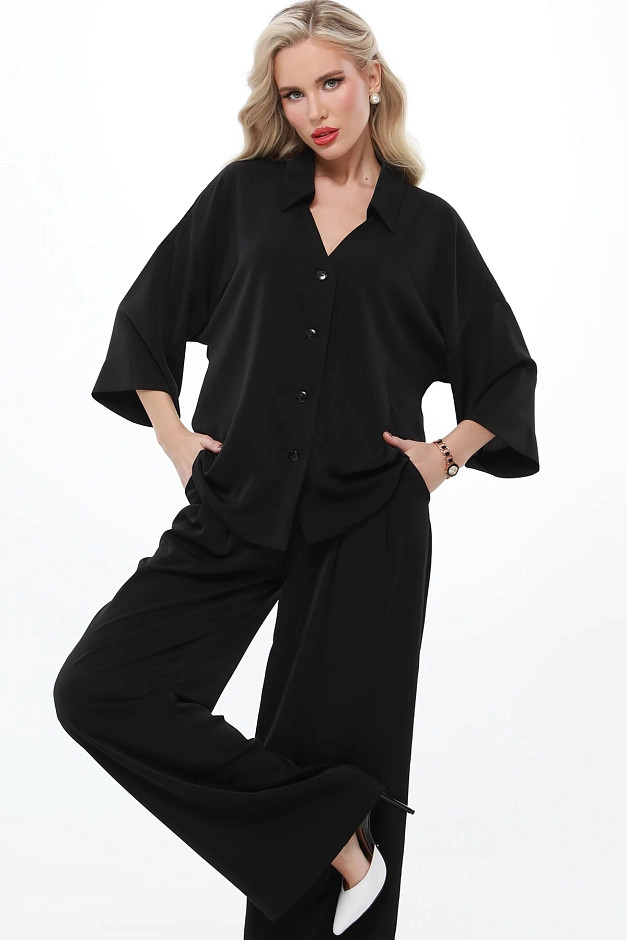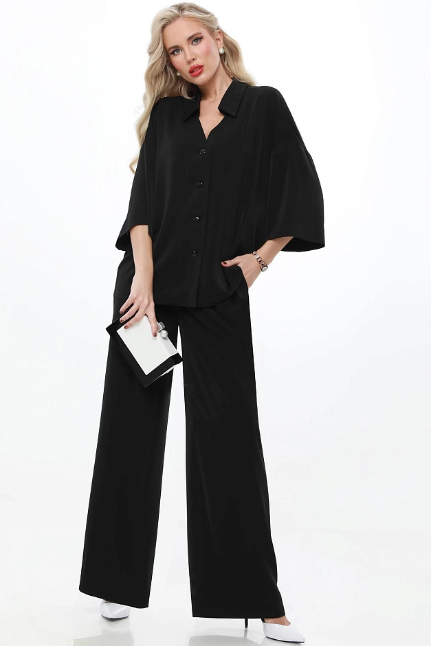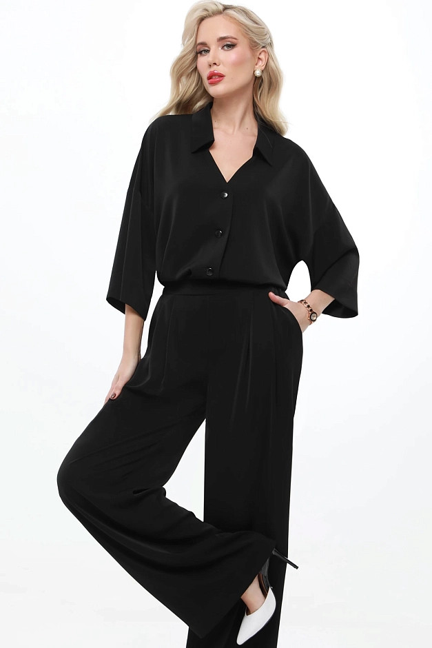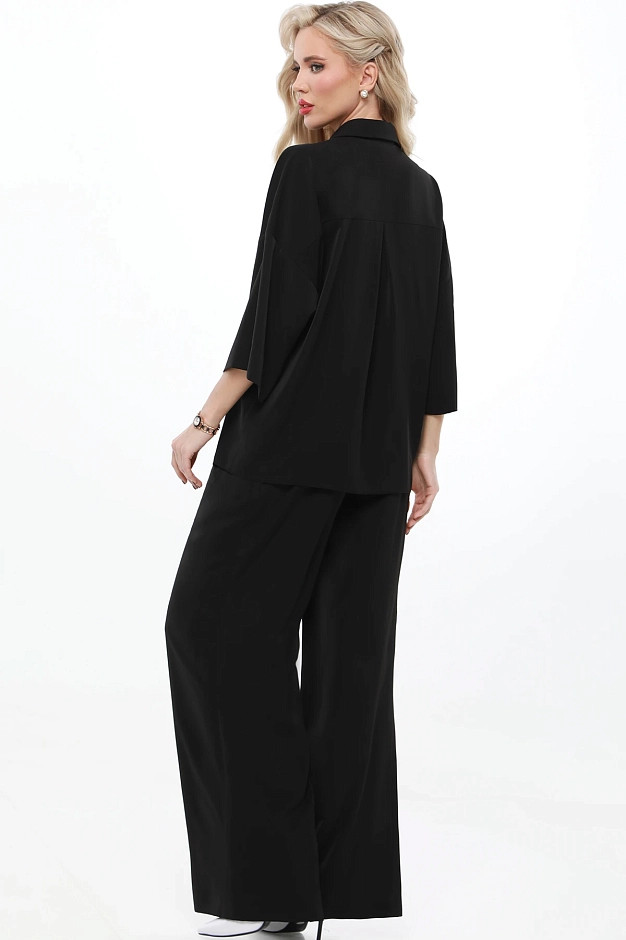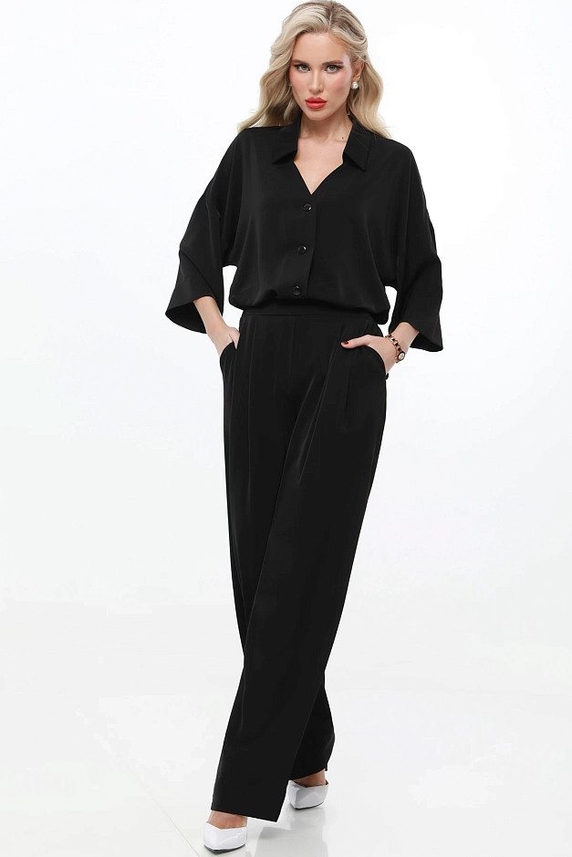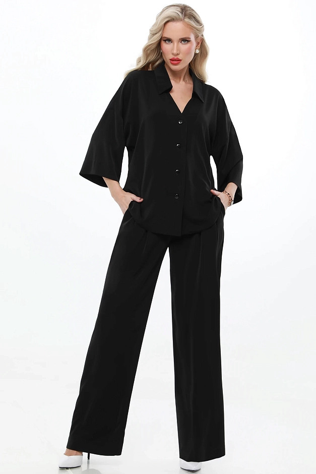 Элегантный и универсальный костюм для любых событий. Блузка с рубашечным воротником и фигурным вырезом горловины придаёт изысканность, а цельнокроеный укороченный рукав создаёт ощущение лёгкости. Брюки прямого кроя с резинкой на спинке и защипами спереди обеспечивают комфорт и элегантность. Костюм легко адаптируется под разные ситуации: для деловых встреч можно дополнить его туфлями-лодочками и небольшой сумкой для строгого и профессионального образа.