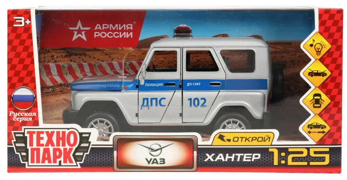 Технопарк Машина полицейская инерционная «УАЗ Hunter»В данный момент этот товар отсутствует в продаже. Возможно, у нас найдется аналогичный или похожий товар здесь. Металлическая инерционная модель «УАЗ Hunter. Полиция» от ТМ «Технопарк» — прекрасный подарок для ребёнка. Металлическая модель, выполненная с учётом всех особенностей прототипа, обязательно понравится вашему ребёнку. Благодаря открывающимся дверям, которые делают машинку максимально похожей на настоящую, всегда можно заглянуть к ней в салон, чтобы убедиться — каждая деталь отлично проработана. Реалистичный дизайн плюс световые и звуковые эффекты данной модели позволят с головой погрузиться в игру, придумывая новые интересные сюжеты. Кроме того, эта игрушка познакомит малыша с марками автомобилей и видами спецтранспорта. |
