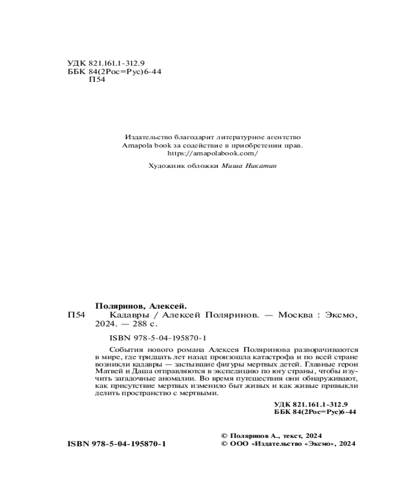 💳 Оплатить за товар можно при получении 🇰🇿 Есть бесплатная доставка по Казахстану от 1 дня 🎁 Копите бонусы с каждой покупки Серия: Loft. Современный роман. В моменте События нового романа Алексея Поляринова разворачиваются в мире, где тридцать лет назад произошла катастрофа и по всей стране возникли кадавры — застывшие фигуры мертвых детей. Главные герои Матвей и Даша отправляются в экспедицию по югу страны, чтобы изучить загадочные аномалии. Во время путешествия они обнаруживают, как присутствие мертвых изменило быт живых и как живые привыкли делить пространство с мертвыми. |