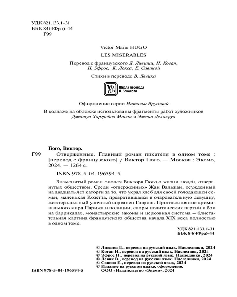 💳 Оплатить за товар можно при получении 🇰🇿 Есть бесплатная доставка по Казахстану от 1 дня 🎁 Копите бонусы с каждой покупки Серия: Полное собрание сочинений (новое оформление) Знаменитый роман-эпопея Виктора Гюго о жизни людей, отвергнутых обществом. Среди «отверженных» Жан Вальжан, осужденный на двадцать лет каторги за то, что украл хлеб для своей голодающей семьи, маленькая Козетта, превратившаяся в очаровательную девушку, жизнерадостный уличный сорванец Гаврош. Противостояние криминального мира Парижа и полиции, споры политических партий и бои на баррикадах, монастырские законы и церковная система — блистательная картина французского общества начала XIX века полностью в одном томе. Роман выдержал множество экранизаций начиная с 1907 года, последняя — сериал 2018 года. Полное издание романа без сокращений. |