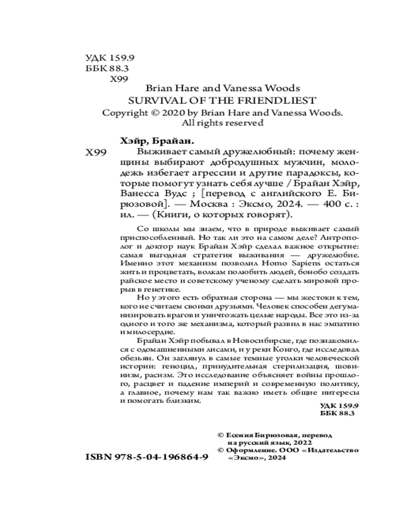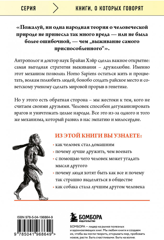 💳 Оплатить за товар можно при получении 🇰🇿 Есть бесплатная доставка по Казахстану от 1 дня 🎁 Копите бонусы с каждой покупки Серия: Книги, о которых говорят Антрополог и доктор наук Брайан Хэйр сделал важное открытие в науке: самая выгодная стратегия выживания — дружелюбие. Именно этот механизм позволил Homo Sapiens остаться жить и процветать, волкам полюбить людей, бонобо создать райское место и советскому ученому сделать мировой прорыв в генетике. Но у этого есть обратная сторона — мы жестоки к тем, кого не считаем своими друзьями. Человек способен дегуманизировать врагов и уничтожать целые народы. Все это из-за одного и того же механизма, который развил в нас эмпатию и милосердие. |