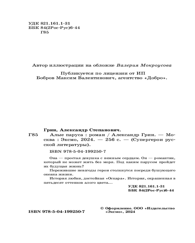 💳 Оплатить за товар можно при получении 🇰🇿 Есть бесплатная доставка по Казахстану от 1 дня 🎁 Копите бонусы с каждой покупки Серия: Супергерои русской литературы Она — простая девушка с нежным сердцем. Он — романтик, который не может жить без моря. Под каким парусом пройдёт их будущая жизнь? Пережившие невзгоды герои столкнутся посреди бушующего океана жизни. История любви, достойная «Оскара». История, окрашенная в пятьдесят оттенков алого цвета... |