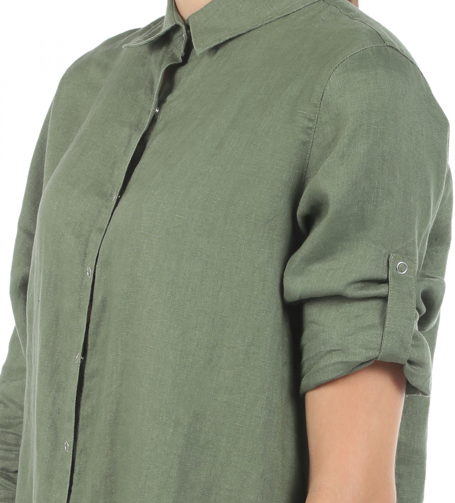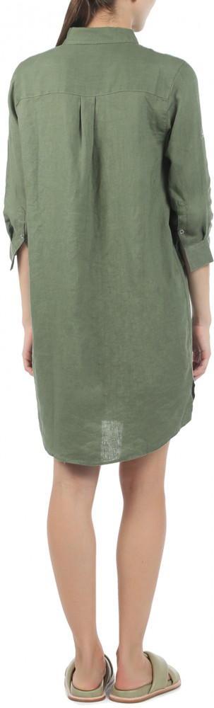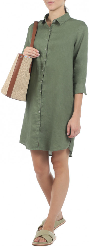 Платье-рубашка свободного прямого кроя на кнопках. Длина выше уровня колен. Длина рукава регулируется патой с застежкой. Носить можно как в сочетании с широким ремнем, так и в виде туники с узкими брюками. Вещь комфортная в носке, с хорошим воздухообменом.