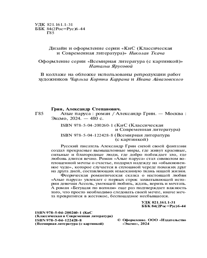 Алые парусаВ данный момент этот товар отсутствует в продаже. Возможно, у нас найдется аналогичный или похожий товар здесь. Серия: КиС (Классическая и Современная литература) Русский писатель Александр Грин силой своей фантазии создал прекрасные вымышленные миры, где живут красивые, сильные и благородные люди, где добро побеждает зло, где любовь длится вечно. Роман «Алые паруса» стал символом воплощенной мечты о счастье, подарил надежду на «обыкновенное чудо», которое случается в сплошной череде похожих друг на друга дней, составляющих изысканную ткань нашей жизни. |