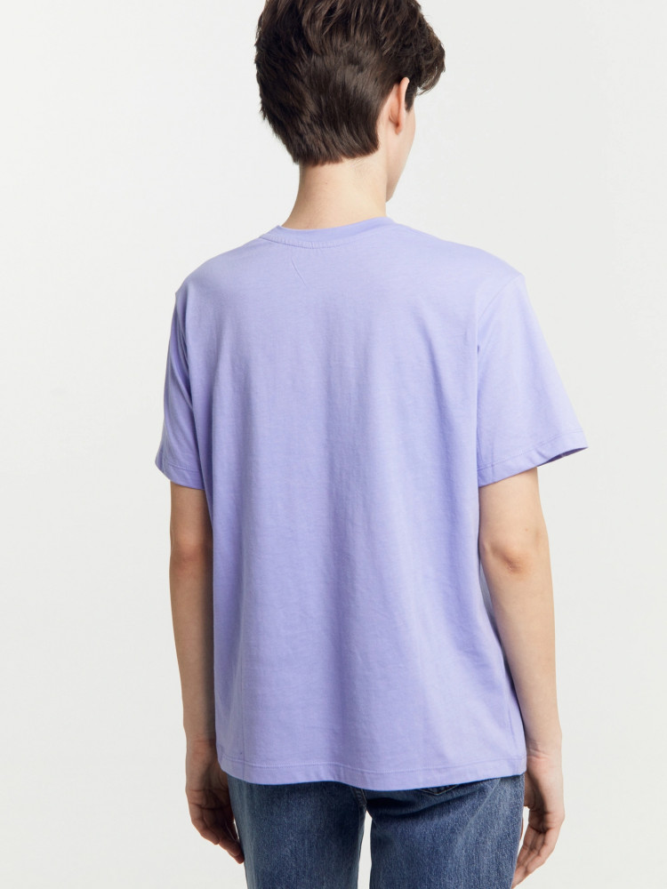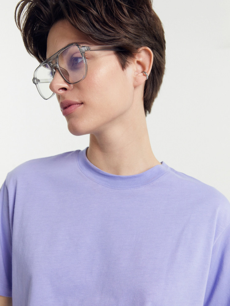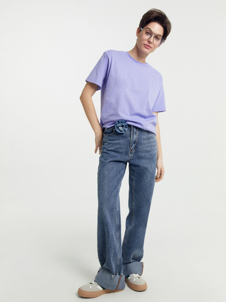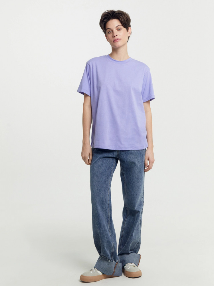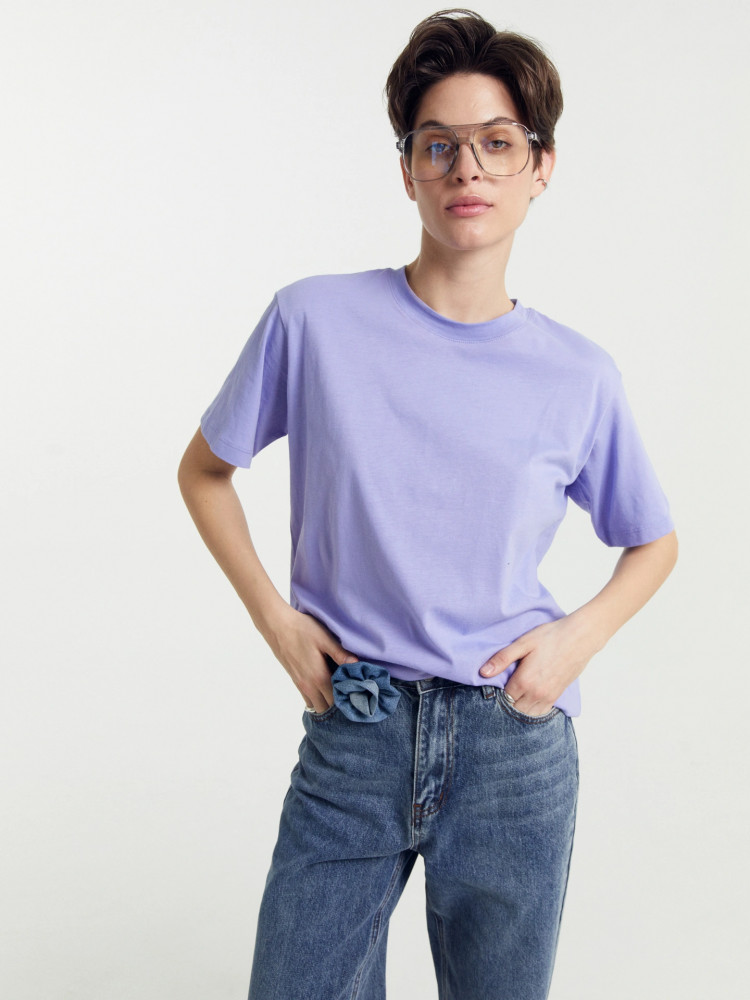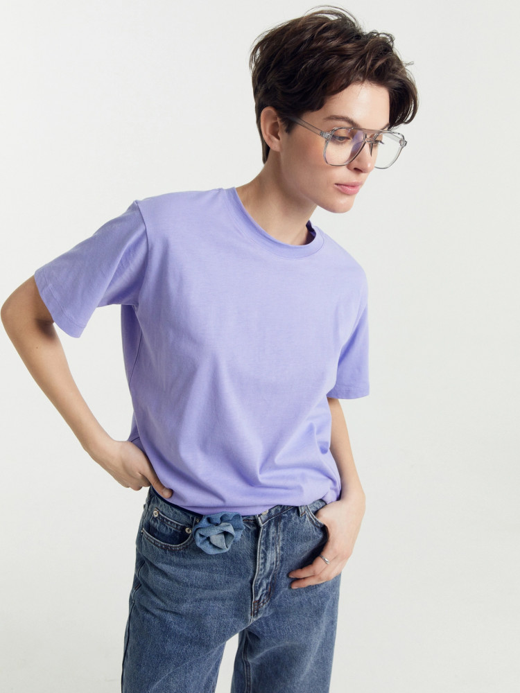 Мне очень понравилась эта футболка. Она свободная, но сидит очень аккуратно, не мешком. Цвет необычный и очень красивый.