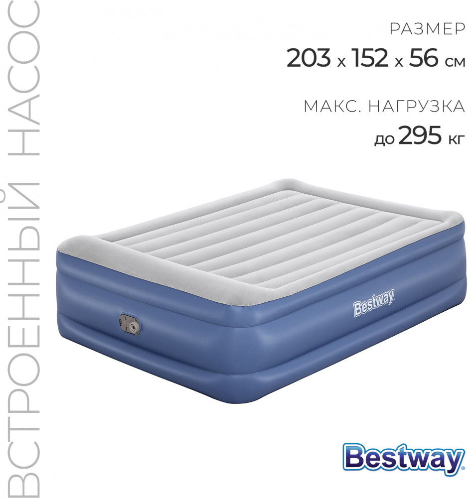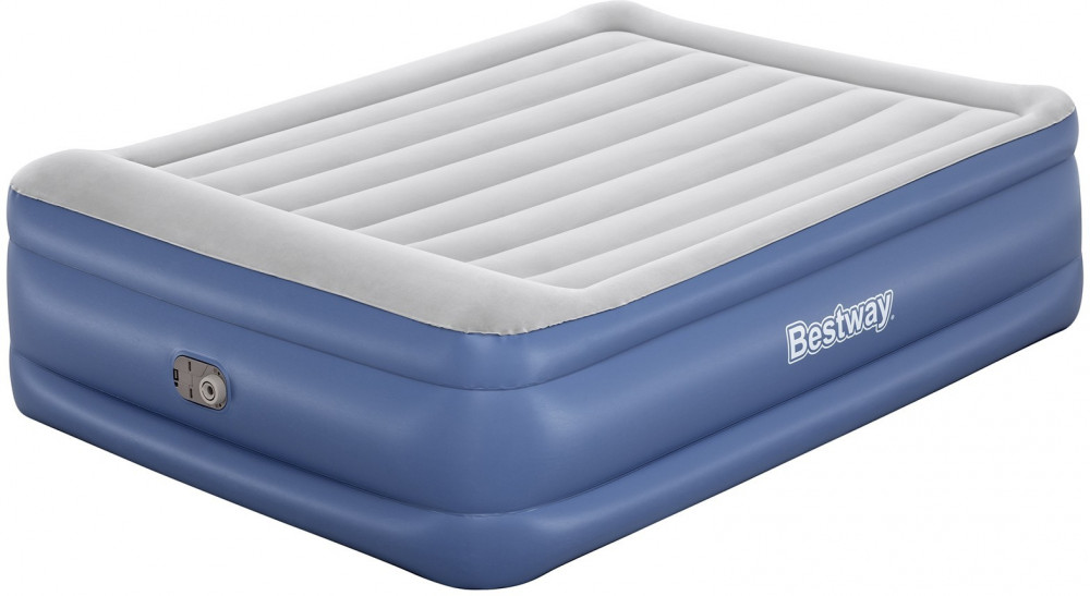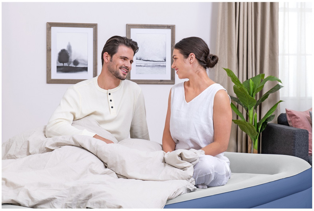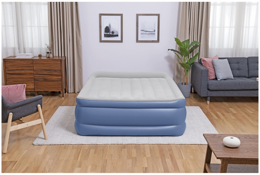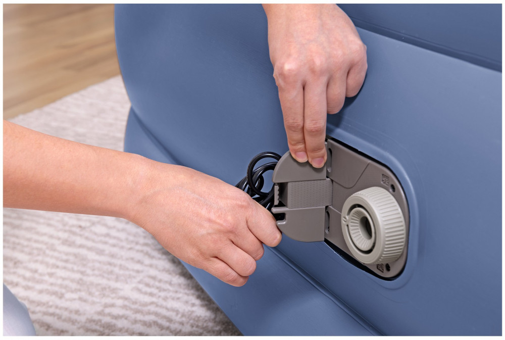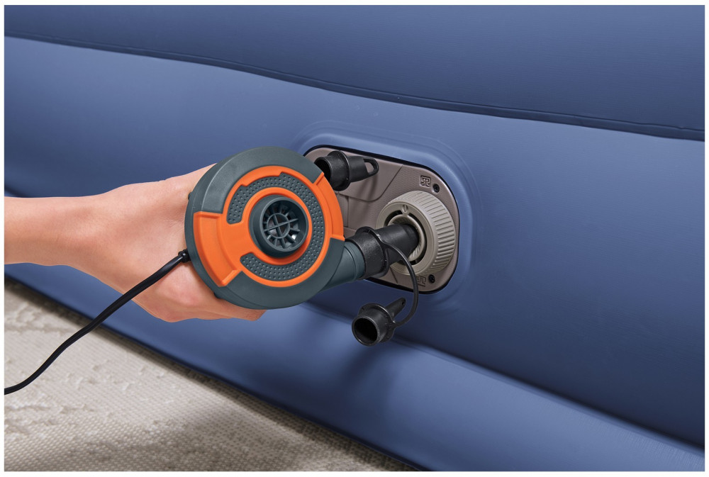 Кровать поставляется с встроенным электронасосом, который позволяет за 5 минут надувать и сдувать кровать, а также дает возможность отрегулировать ее упругость. Насос подключается к стандартной электрической розетке. При отсутствии электричества, кровать можно накачать обычным механическим насосом. Для этого кровать снабжена специальным клапаном для подключения внешнего насоса. В комплект входит удобная сумка для переноски кровати и специальная самоклеющаяся заплатка.
