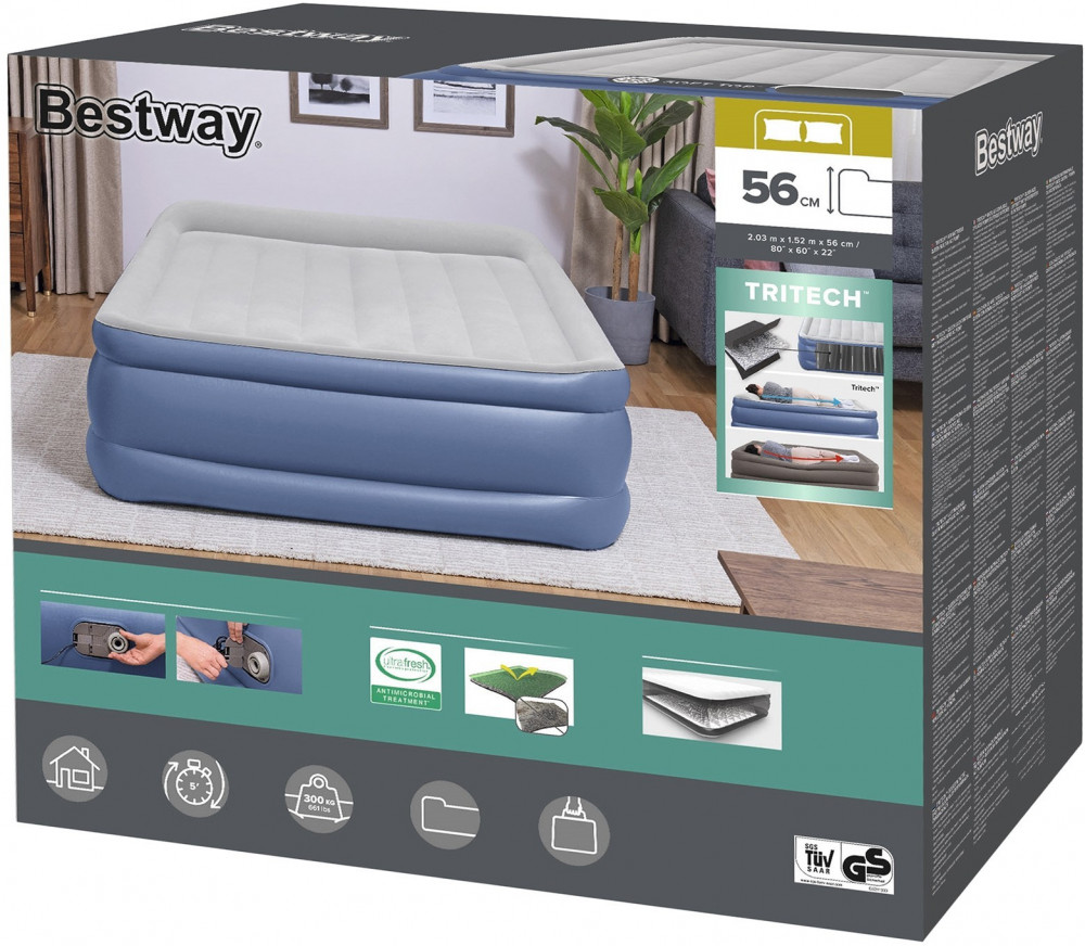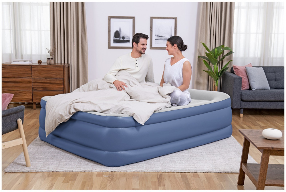 Двуспальная надувная кровать Tritech Airbed (Queen) изготовлена по запатентованной технологии Sturdy I-beam. Внутренние перегородки представляют собой продольные секции, под весом тела не деформируются и постоянно остаются устойчивыми. Кровать имеет удобный эргономичный подголовник. Приятное флокированное покрытие верхней поверхности кровати, не даст соскальзывать постельному белью и покрывалам, легко чистится без применения специальных средств.