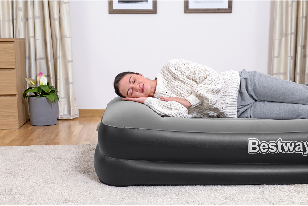 Приятное флокированное покрытие (искусственная замша) поверхности кровати, не даёт соскальзывать постельному белью, легко чистится без применения специальных средств.Кровать имеет надежный встроенный электронасос, который позволяет за несколько минут надувать и сдувать кровать, а также дает возможность отрегулировать ее упругость. Насос подключается к стандартной электрической розетке. При отсутствии электричества, кровать можно накачать обычным механическим насосом. Для этого кровать снабжена специальным клапаном для подключения внешнего насоса.
