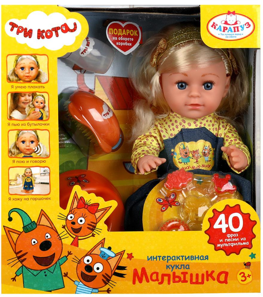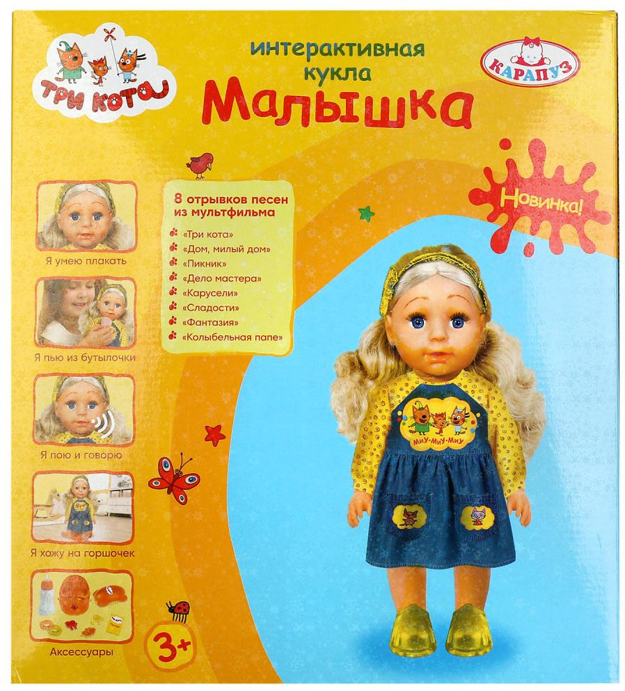 💳 Оплатить за товар можно при получении 🇰🇿 Есть бесплатная доставка по Казахстану от 1 дня 🎁 Копите бонусы с каждой покупки Серия: Три кота Озвученная кукла «Три кота. Малышка» от ТМ «Карапуз» станет прекрасным подарком для маленьких поклонниц мультсериала про любознательных котят. |