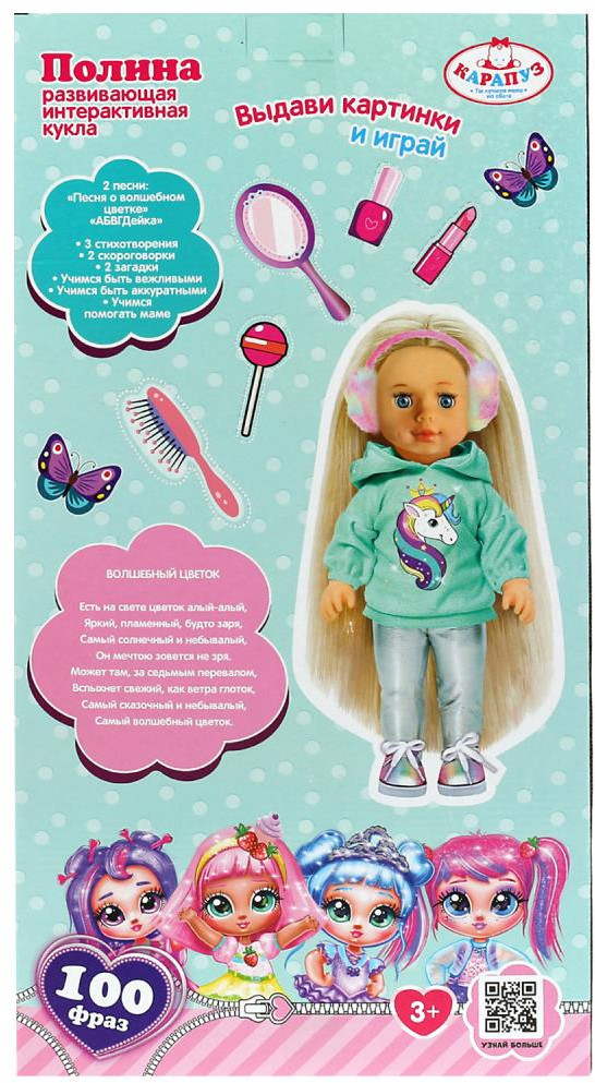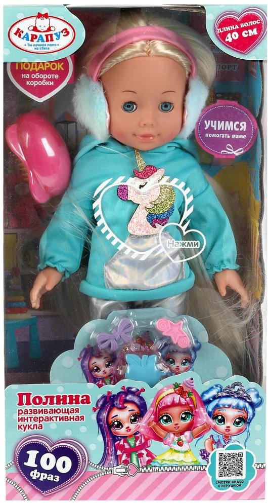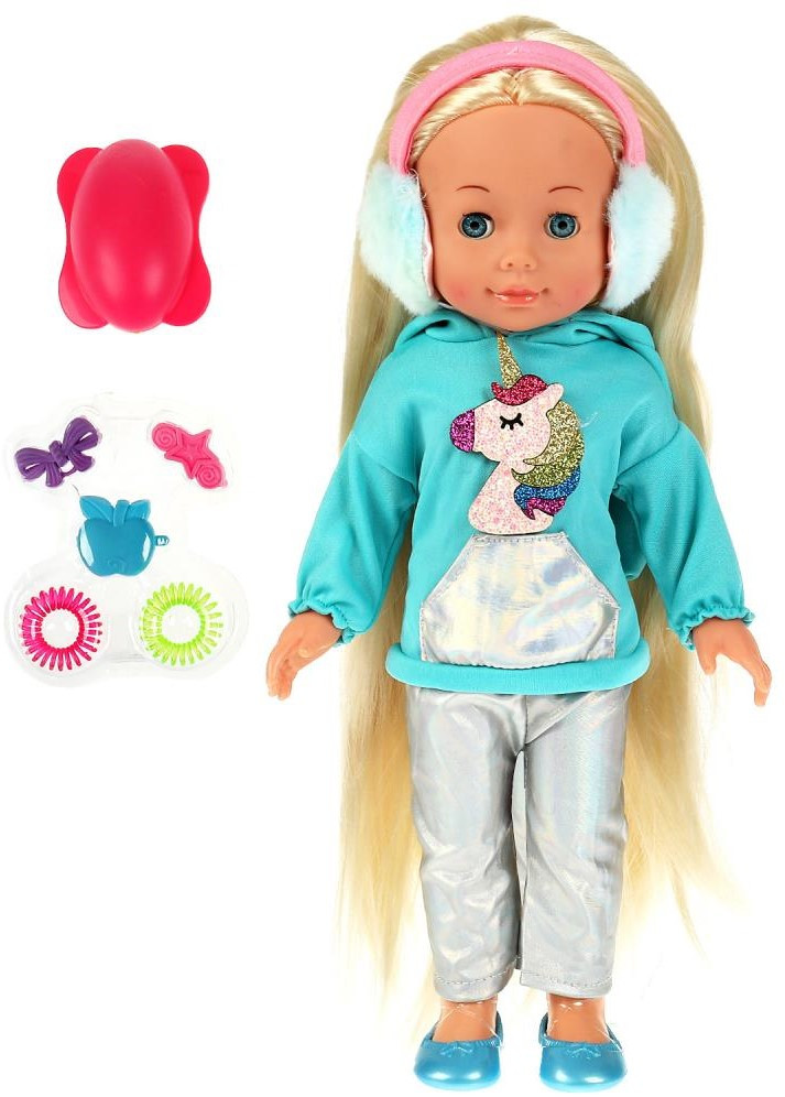 Развивающая интерактивная кукла «Полина» ТМ «Карапуз» станет прекрасным подарком для вашей маленькой принцессы. Милая кукла с детально проработанным личиком обязательно понравится малышке. Полина одета в яркую кофточку с аппликацией в виде единорога и серебристые легинсы. На голове —пушистые розовые наушники. Одежда легко снимается и надевается. У куклы длинные красивые волосы. Хозяйка куколки легко сможет сделать Алёнке причёску по своему желанию, для этого в наборе имеются необходимые аксессуары.