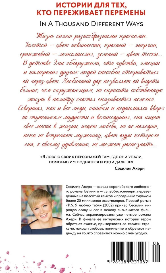 💳 Оплатить за товар можно при получении 🇰🇿 Есть бесплатная доставка по Казахстану от 1 дня 🎁 Копите бонусы с каждой покупки Жизнь сияет разнообразными красками. Золотой — цвет невинности, красный — энергии, оранжевый — легкомыслия, зеленый — цвет тоски... В детстве Элис обнаружила, что чувства, эмоции и намерения других людей способны открываться ей через цвет. Аура подсказывает ей, искренен человек или лжив, надежен или сомнителен, счастлив или неудовлетворен… Необычный дар позволяет ей видеть больше, чем окружающие, но окрасить собственную жизнь в палитру счастья оказывается нелегко. Первое наставление на путь гармонии ей дает сама природа, еще несколько бесценных советов Элис получает от своей необычной подруги. Совершая, как и все люди, ошибки и поднимаясь вверх по ступенькам мудрости и великодушия, она ищет свое место в жизни, ищет любовь, но не находит, пока не встречает мужчину, цвет ауры которого она, к своему удивлению, не может распознать... |