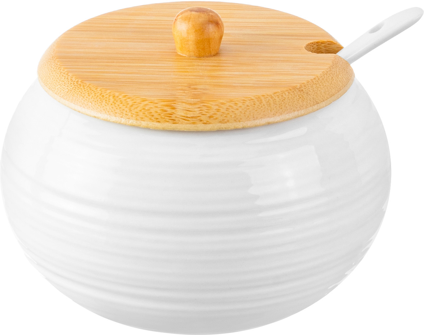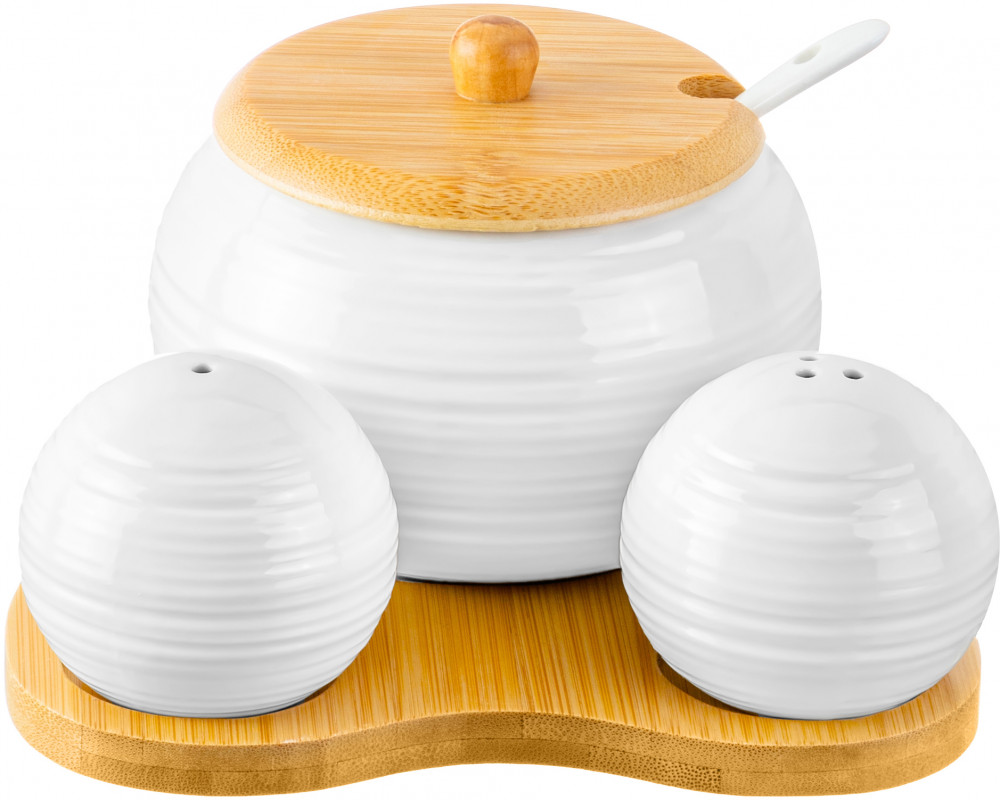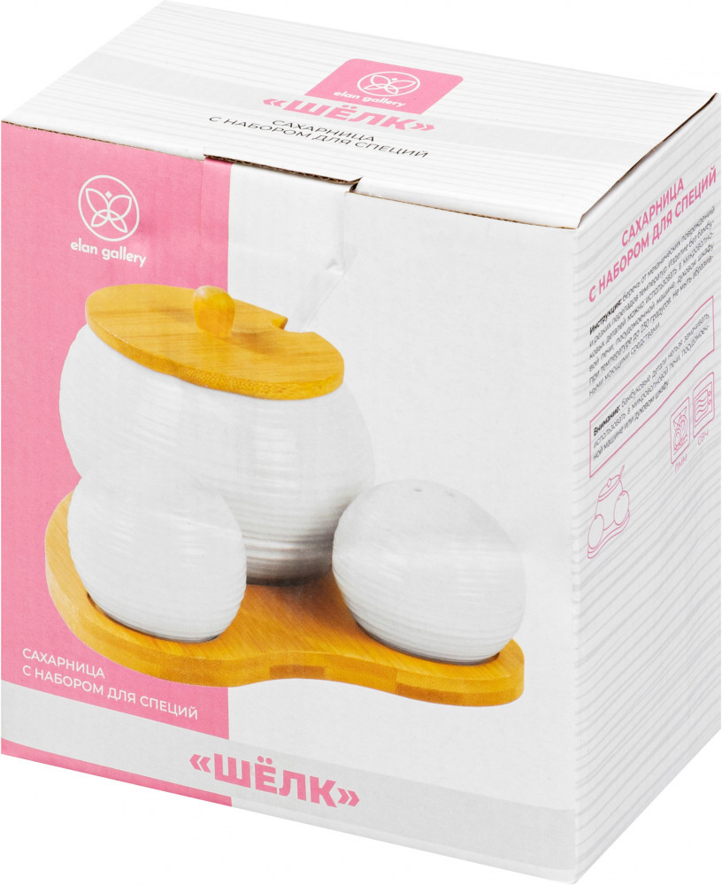 Набор Elan Gallery серии «Шелк» состоит из сахарницы объёмом 350 мл, солонки и перечницы на бамбуковой подставке. Размер набора — 15 × 15,5 × 9 см. Сахарница 11 × 11 × 8,5 см имеет крышку из бамбука (высота изделия без крышки — 6,5 см) и фарфоровую ложку в комплекте. Баночка с ложечкой подойдёт не только для хранения сахара, но и мёда, варенья или джема. Размер солонки и перечницы: 6 × 6 × 5 см каждая баночка (объём по 70 мл). Набор выполнен из белого фарфора и натурального бамбука. Сахарница и ёмкости для специй имеют рельефный узор в виде полосочек и станут украшением вашего стола как в будни, так и на праздник. Баночки для специй круглой формы внизу имеют отверстия для наполнения, которые закрываются пробками. В них можно насыпать соль, перец или любые приправы.