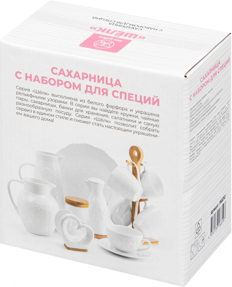 Фарфоровые детали без бамбуковых крышки и подставки можно использовать в микроволновой печи и посудомоечной машине. Изделия из бамбука нельзя замачивать! Столовый набор поставляется в стильной картонной упаковке. Сахарница и набор для специй из серии посуды «Шелк» станет настоящим украшением любой кухни или приятным подарком для ваших близких!