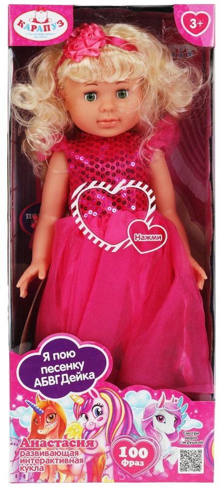 Развивающая интерактивная кукла «Анастасия» от ТМ «Карапуз» станет прекрасным подарком для вашей маленькой принцессы. Милая кукла с детально проработанным личиком обязательно понравится малышке. Анастасия одета в нарядное платье цвета фуксии с лифом из пайеток и пышной юбкой. На голове — лента с цветком. Одежда легко снимается и надевается. У куклы длинные красивые волосы. Хозяйка куколки легко сможет сделать причёску по своему желанию, для этого в наборе имеются необходимые аксессуары.