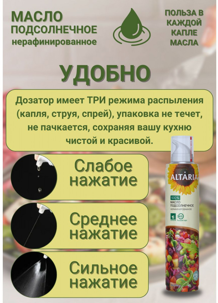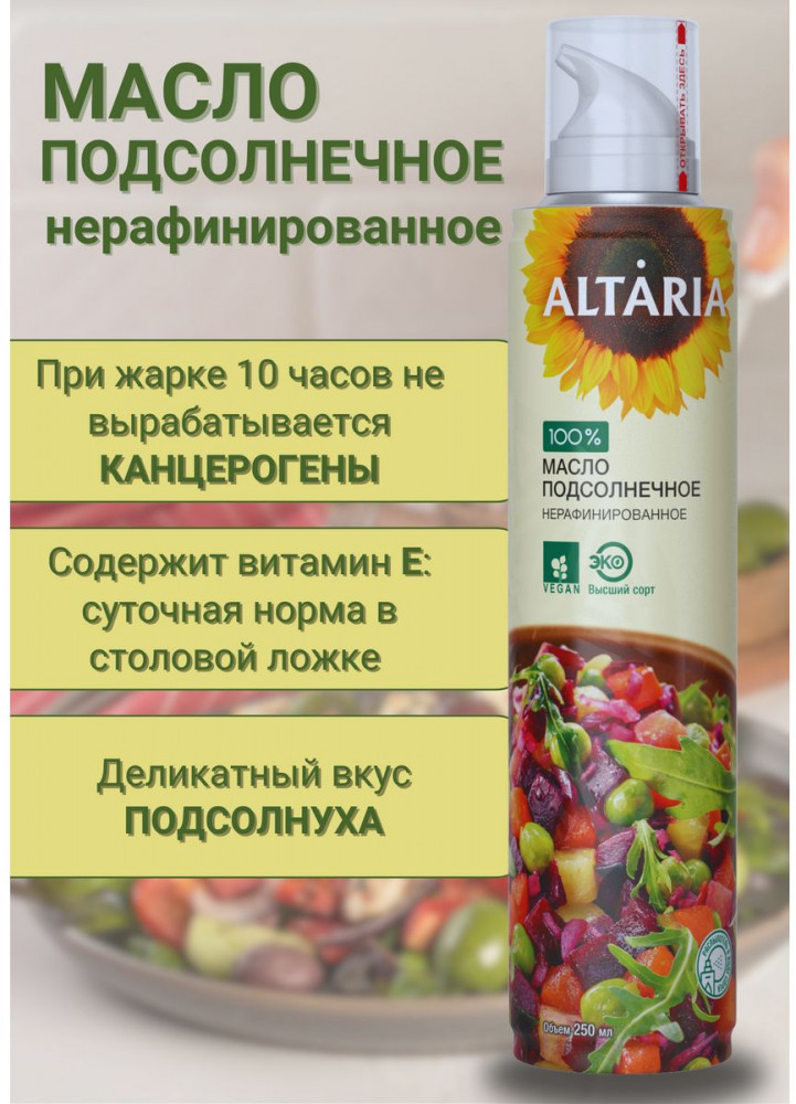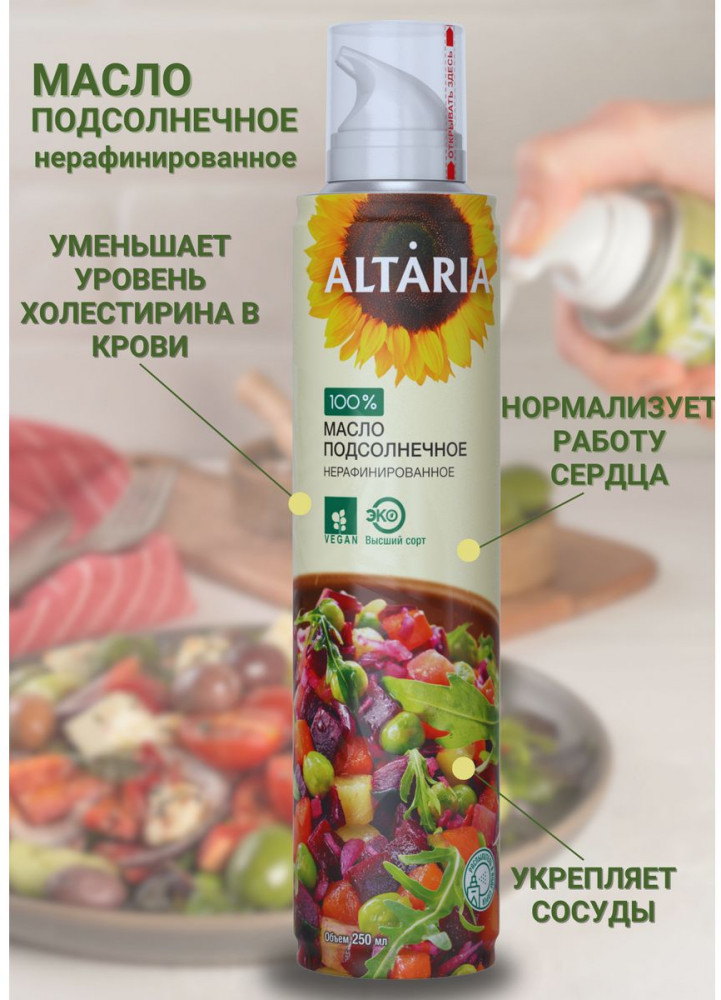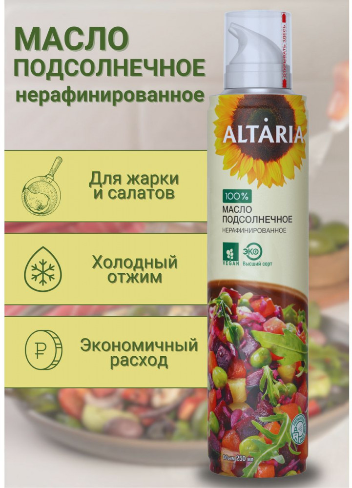 Altaria Масло-спрей подсолнечное нерафинированноеВ данный момент этот товар отсутствует в продаже. Возможно, у нас найдется аналогичный или похожий товар здесь. Масло холодного отжима высшего сорта для заправки салатов. Изготавливается только из фермерского сырья, при выращивании которого используются исключительно органические удобрения. Весь подсолнечник выращен в Алтайском крае — одном из самых экологически чистых регионов России. |