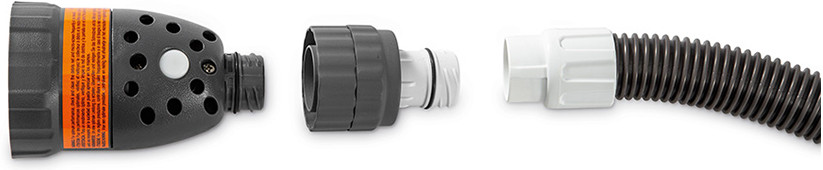 Благодаря использованию поплавка шланг удерживается на поверхности воды, что предохраняет его от повреждений. При включенном фильтр-насосе образуется циркуляция воды, при которой она вместе с мусором затягивается в пылесос и проходит очистку. Мощность всасывания зависит от мощности фильтр-насоса. В комплект входит шланг 6,5 метров, диаметром 38 мм. Длина шланга идеально подойдет к круглым бассейнам до 7,32 м и прямоугольным 9,75 × 4,88 м. Приятным бонусом от производителя является наличие поплавка и автоматической системы с поворотным подсоединением, которая предотвращает запутывание шланга. Клапан давления — предупреждает поступление воды в пылесос под высоким давлением, понижая его до оптимального значения. Этим продлевая срок службы работы пылесоса. Подсоединяется к выпускному соединителю диаметром 38 мм; форсунке диаметром 32 мм (с мелкой резьбой, форсунка 11070) не совместим с форсункой (с крупной резьбой 12365). Благодаря встроенному отсеку для мусора (бак емкостью до 1,5 литра), частота очистки пылесоса сводится к минимуму, а простота конструкции приятно радует, стоит только открыть нижнюю крышку пылесоса, нажав рычаги для разблокировки и контейнер для очистки уже доступен.