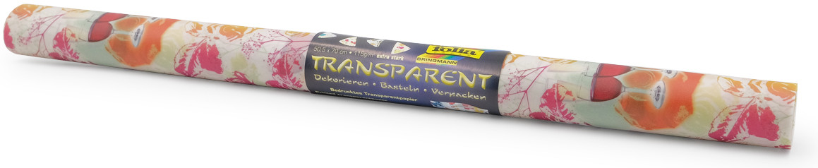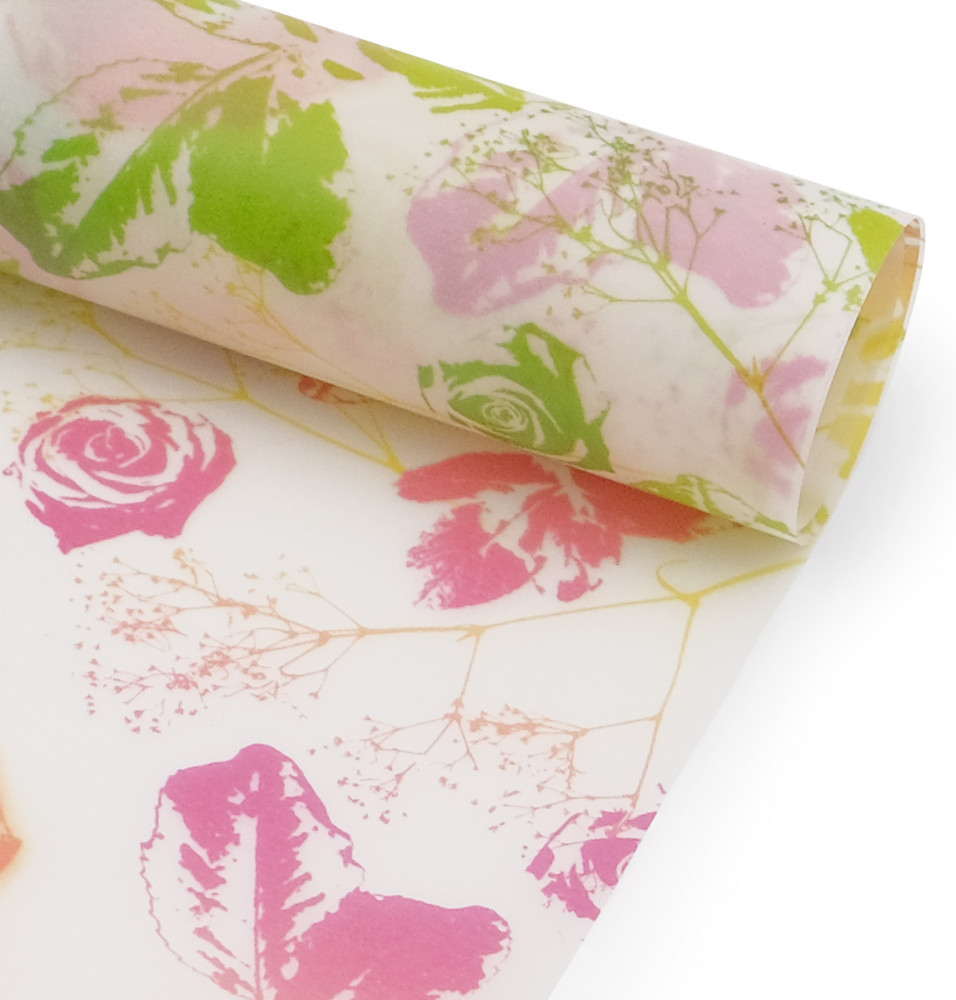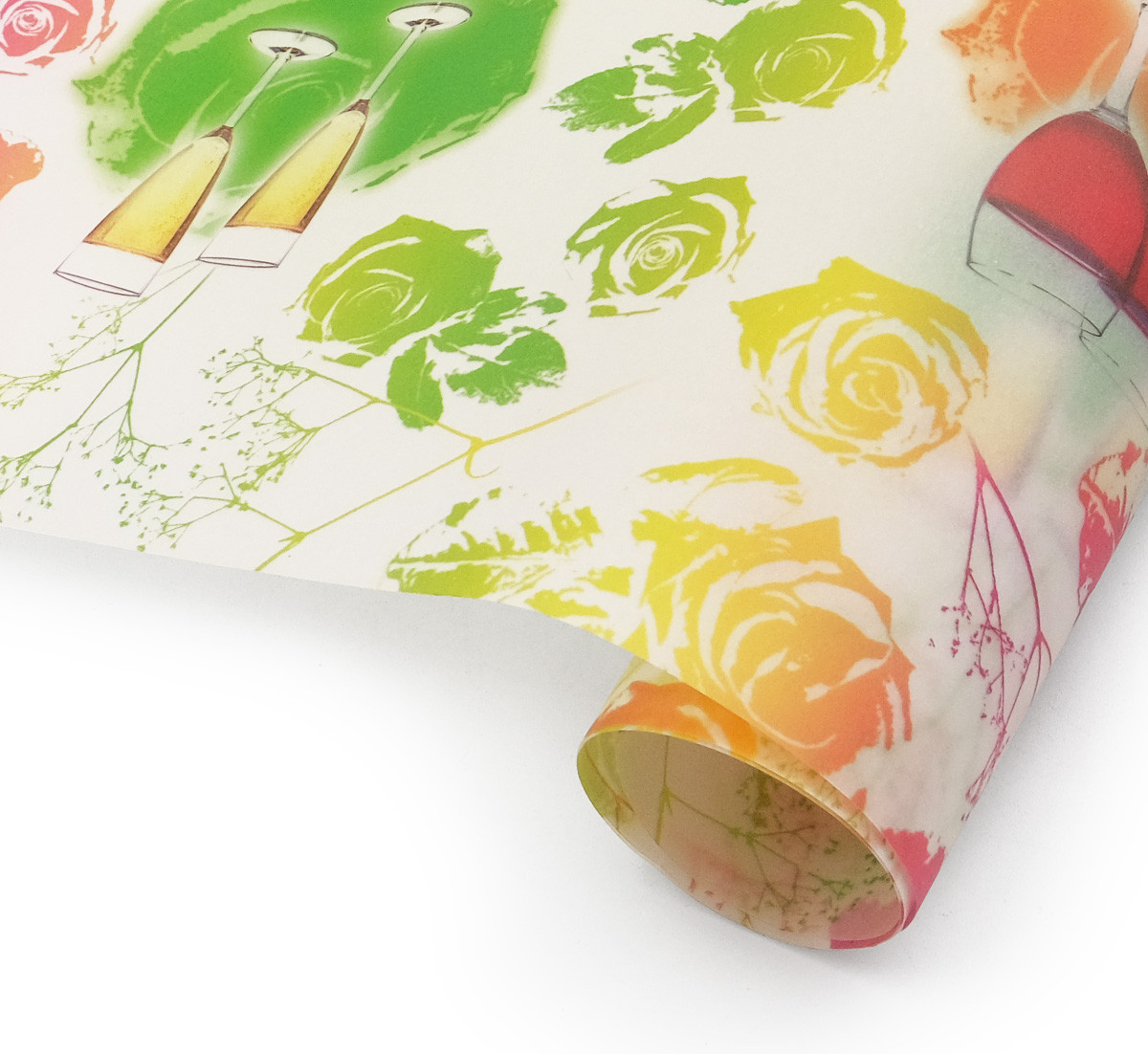 Транспарентная бумага — полупрозрачная бумага с рисунком. Хорошо держит форму, рисунок не стирается от трения и не пачкает руки. Таким материалом в основном оформляют коробки с подарками.
