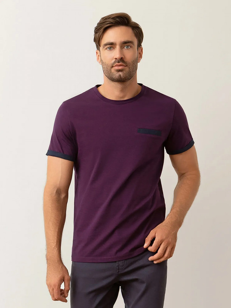Стильная футболка из хлопка. Силуэт прямой. Длина до середины бедер. Горловина круглая, рукава короткие. Особенности модели — контрастная отделка рукава. Имитация кармана. Рост модели на фото — 185 см.