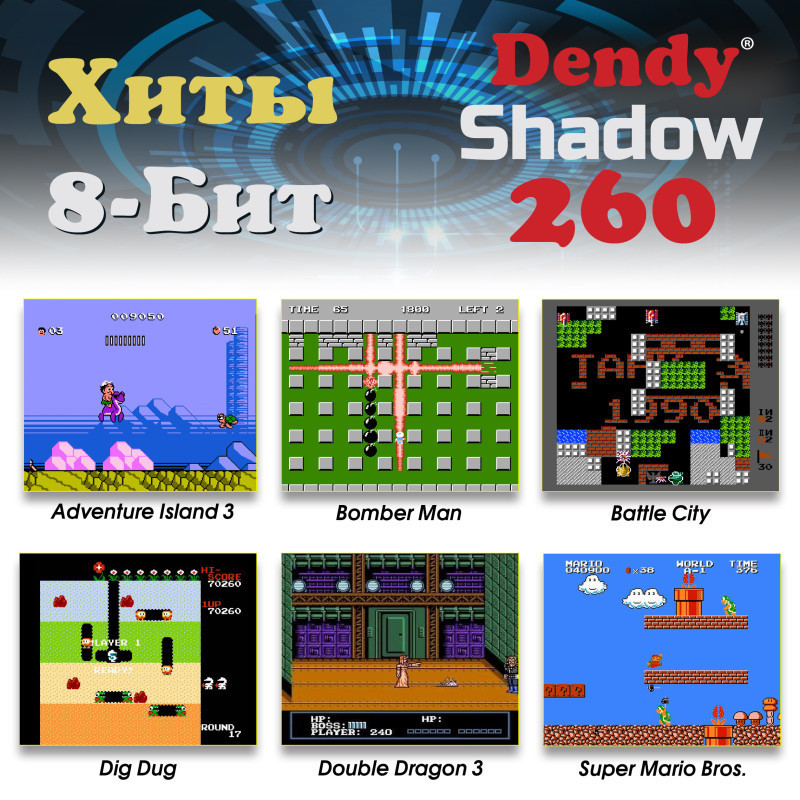 С ретроприставкой Dendy Shadow вы получаете доступ к 260 классическим играм, которые стали настоящими хитами своего времени. От Super Mario Bros и Contra до Battle City. Оригинальные звук и картинка, игры на одного и двух игроков, совместимость с картриджами 8-бит. Интересно, динамично, развивает скорость реакции!