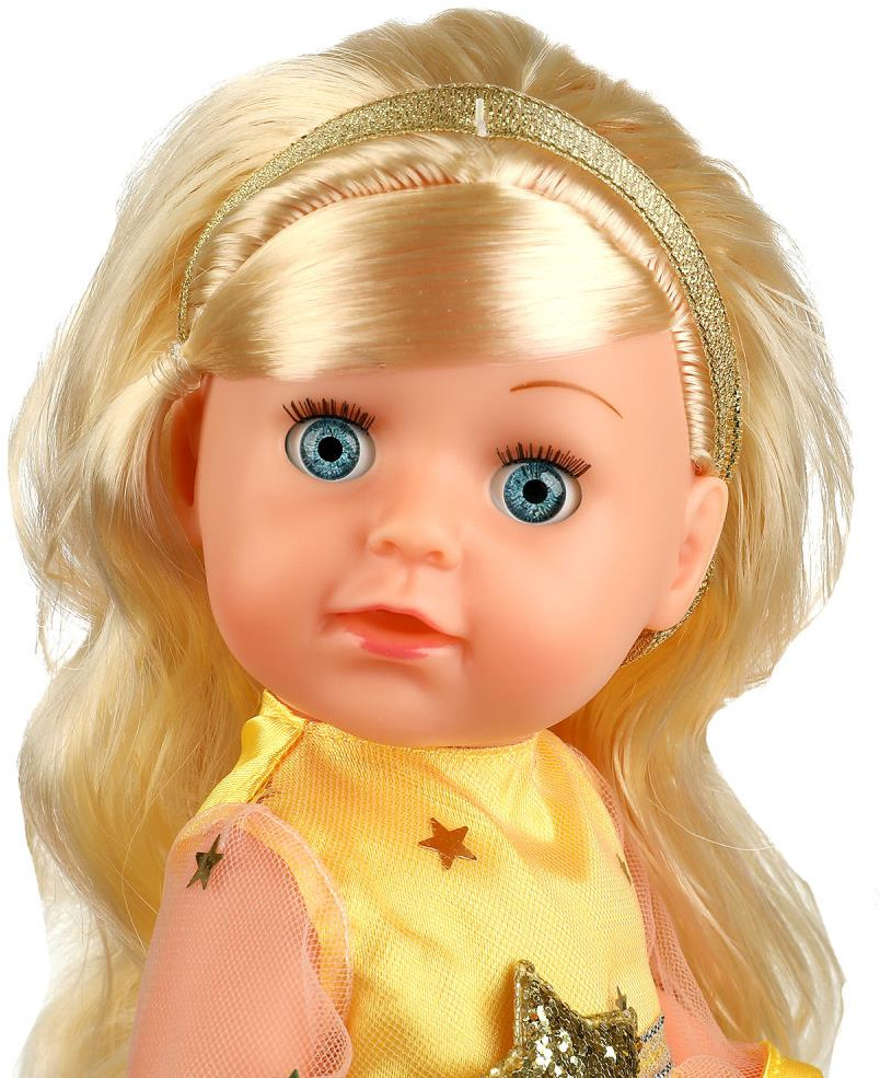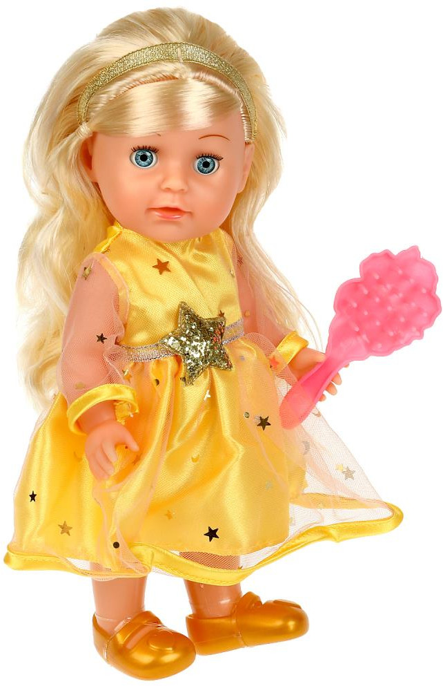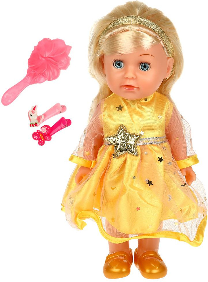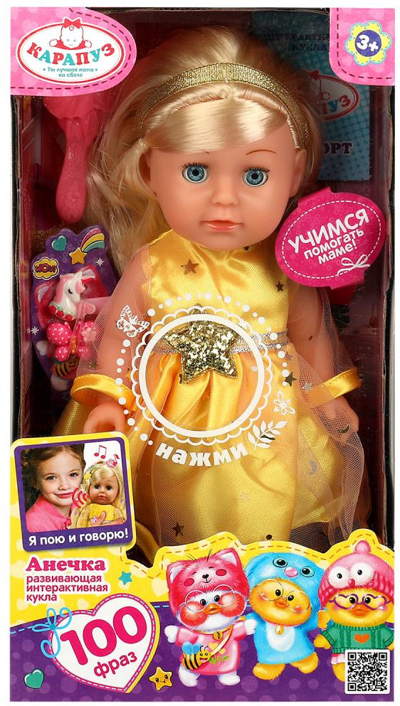 Развивающая интерактивная кукла «Анечка» ТМ «Карапуз» станет прекрасным подарком для вашей маленькой принцессы. Милая кукла с детально проработанным личиком обязательно понравится малышке. Анечка одета в нарядное платье жёлтого цвета с декором в виде звёзд и аппликации-звезды. Голову украшает блестящая золотистая ленточка. Одежда легко снимается и надевается. У куклы длинные красивые волосы. Хозяйка куколки легко сможет сделать Анечке причёску по своему желанию, для этого в наборе имеется расчёска и заколки.