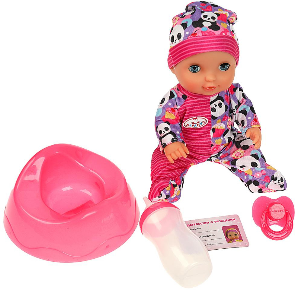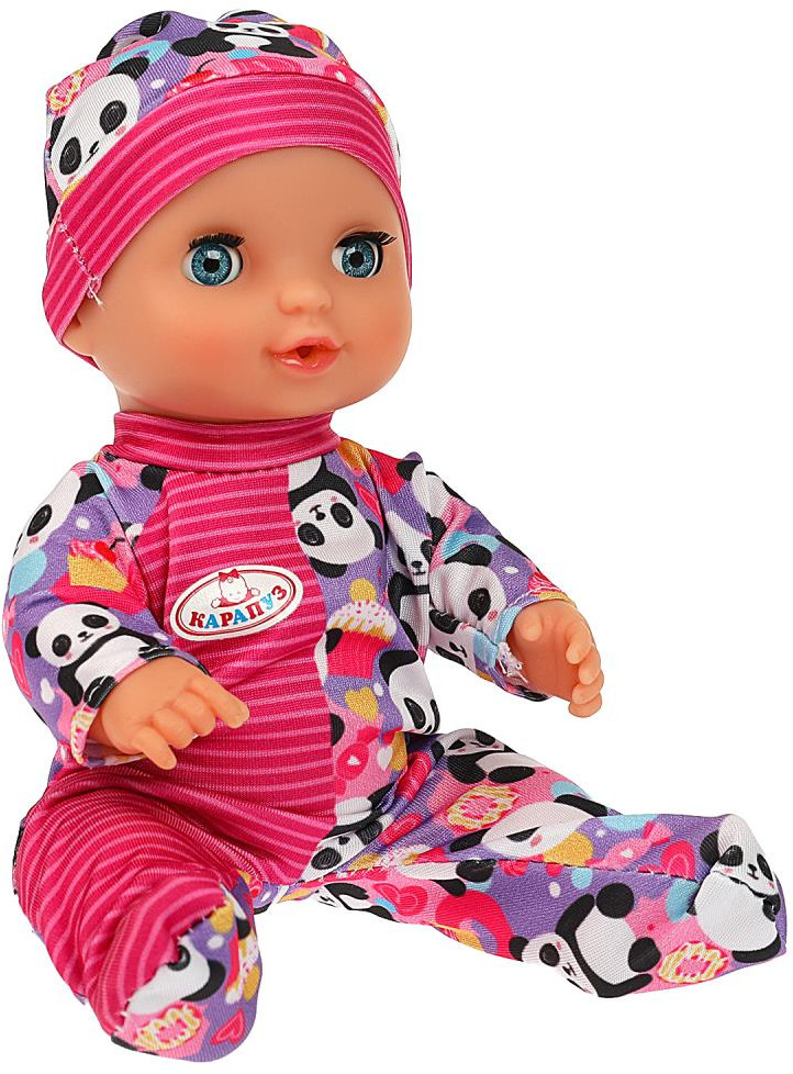 Милый пупс Настя с детально проработанным личиком обязательно понравится вашей малышке. Кукла одета в симпатичный комбинезон в розово-сиреневой цветовой гамме с принтом в виде пандочек, на голове — шапочка в тон. Одежда легко надевается и снимается. Для более интересной игры в комплекте с пупсом идут разнообразные аксессуары.