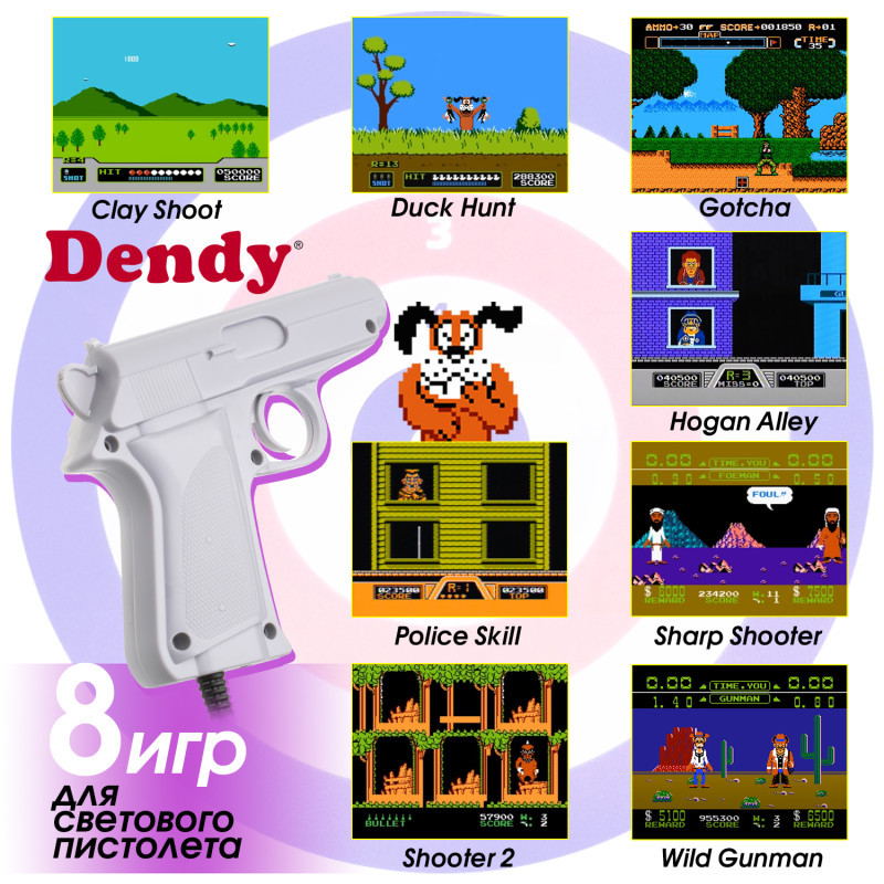 Пистолет выполнен из ударопрочного ABS пластика серого цвета. Оптимальная длина кабеля 1 метр позволяет находиться на комфортном расстоянии от экрана телевизора. Модель светового пистолета GU-9W-8Bit имеет 9-пиновый разъем и подключается к приставке в разъем для второго джойстика. Оттачивайте меткость и скорость реакции играя в одиночку или с друзьями!