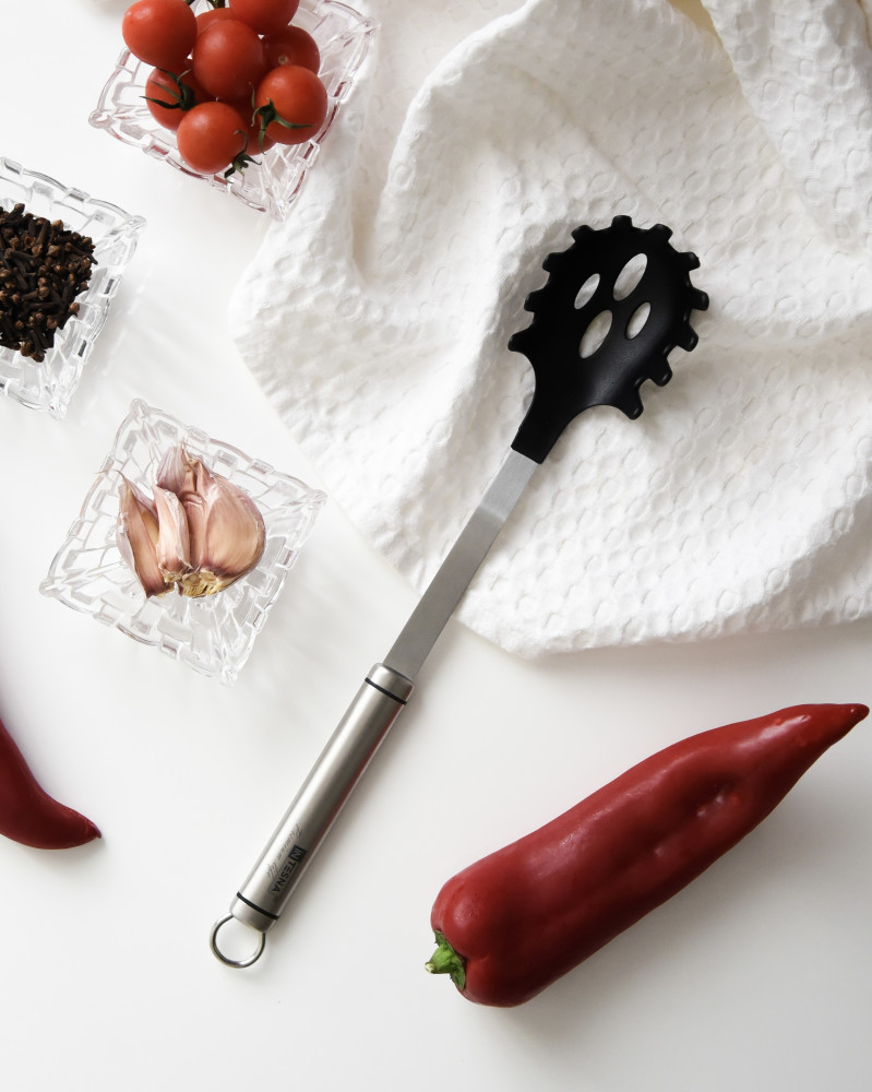 Intesna Ложка для спагетти «Premium Life»В данный момент этот товар отсутствует в продаже. Возможно, у нас найдется аналогичный или похожий товар здесь. Серия: Premium Life Ложка для спагетти идеально подойдет для приготовления пасты. Чтобы не использовать каждый раз дуршлаг для вытаскивания сваренных спагетти – ложка поможет вытащить из кастрюли спагетти в считанные секунды не повредив пасту. Ложка для пасты имеет три отверстия для удобного слива излишков воды, не гнется и его размер соответствует одной порции. Кроме этого, круглые зубцы по краям позволяют легко собирать спагетти из горячей воды, цельнометаллическая конструкция из высококачественной нержавеющей стали устойчива к высоким температурам. А любители линии оценят стильный дизайн. Снабжена удобным ушком для подвешивания на вешалку. |
