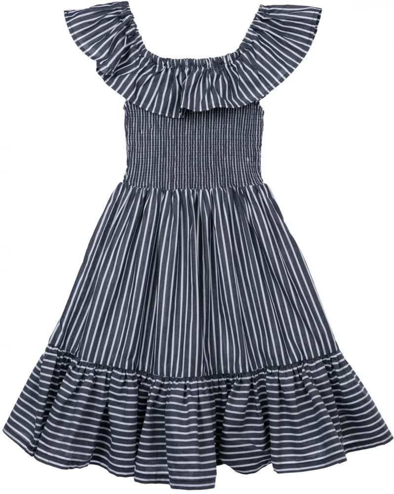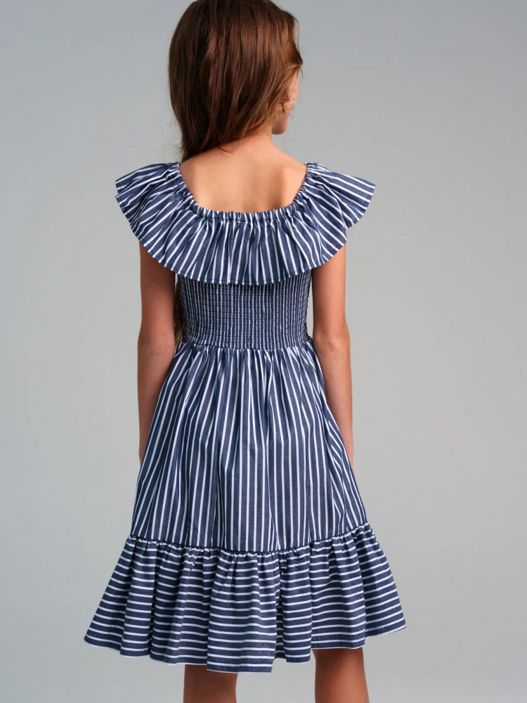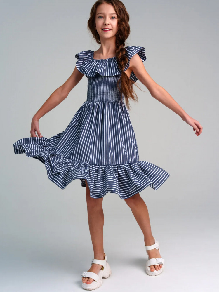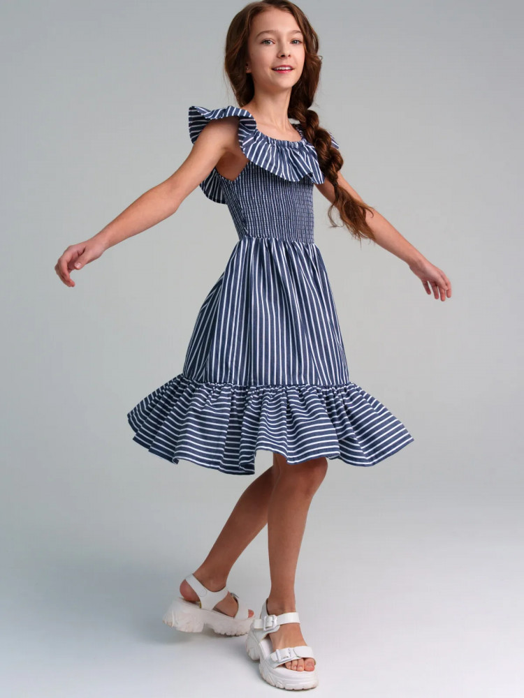Стильное и уютное детское платье свободного силуэта для девочек. Изделие выполнено из высококачественного хлопка. Красивая рюша и резинка на лифе придают платью праздничный вид. Это легкое и удобное платье подарит вашей маленькой моднице комфорт и стильный образ.