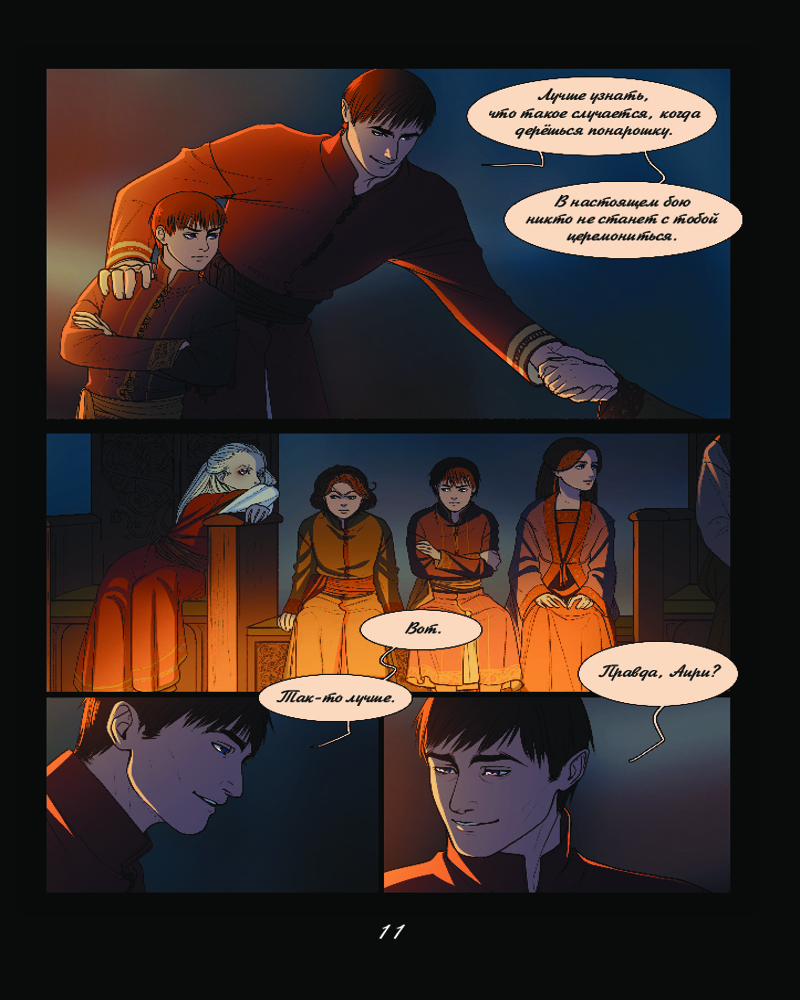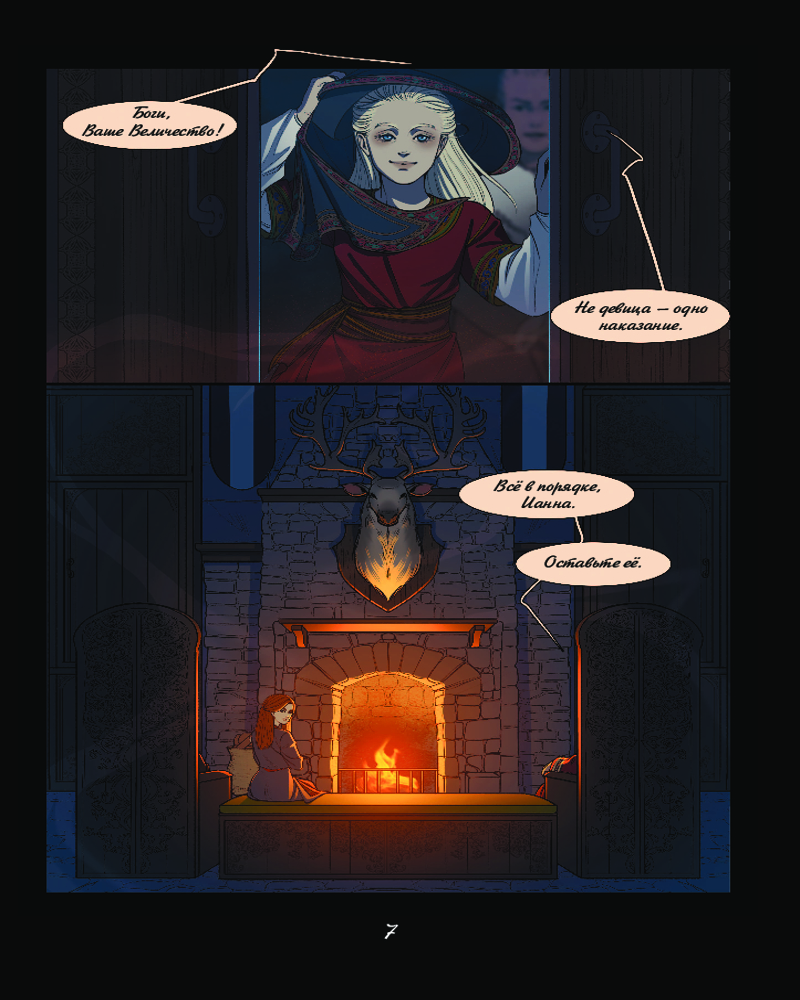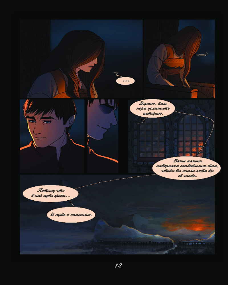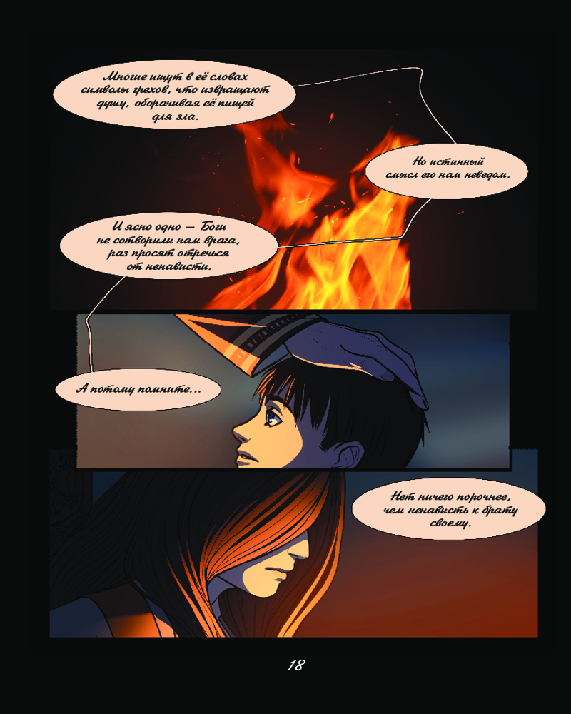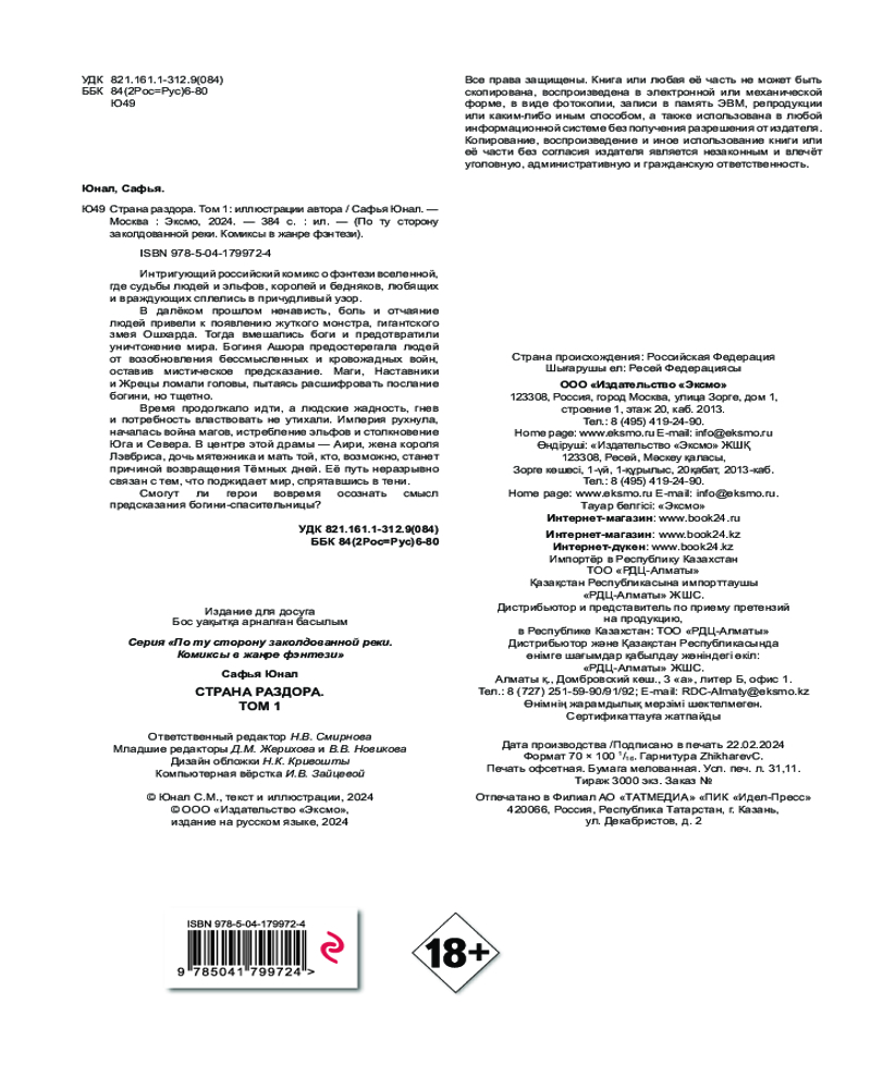 Серия: По ту сторону заколдованной реки. Комиксы в жанре фэнтези Когда-то люди были полны гнева и способны только на разрушение. Ненависть и боль, скопившиеся в их сердцах, пробудили ужасного монстра. Человечество погрузилось во мрак и отчаянье. Спасением стали Истинные Боги, которые подарили людям способность созидать. С тех пор прошло много лет, и люди вновь идут с мечом друг на друга. Человеческая жизнь снова начинает терять свою ценность, затмеваемая жаждой власти и богатств. Так, вступив в брак ради политического союза, Аири стойко переносит свою действительность, полную горестей и лишений. Однако, когда её семье на Юге требуется помощь, её муж, король Лэвбриса, Тенав, не торопится поддержать своих родственников и союзников.  |
