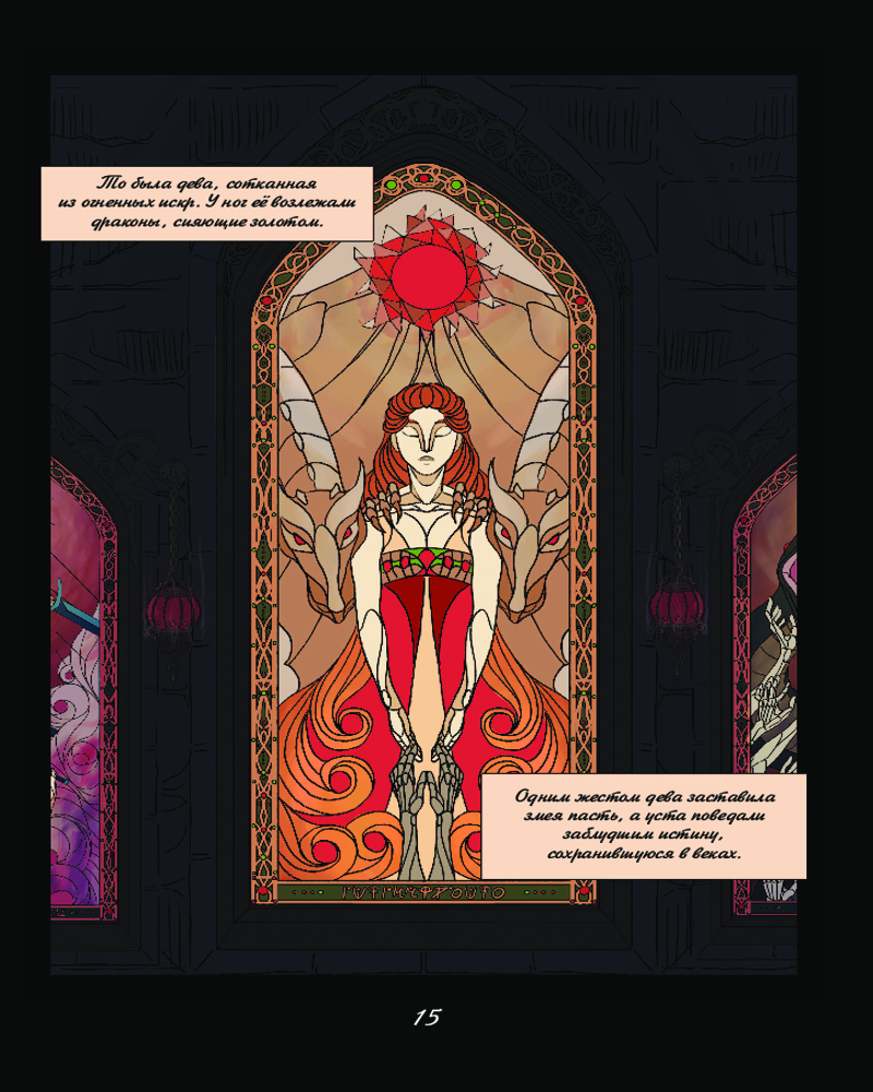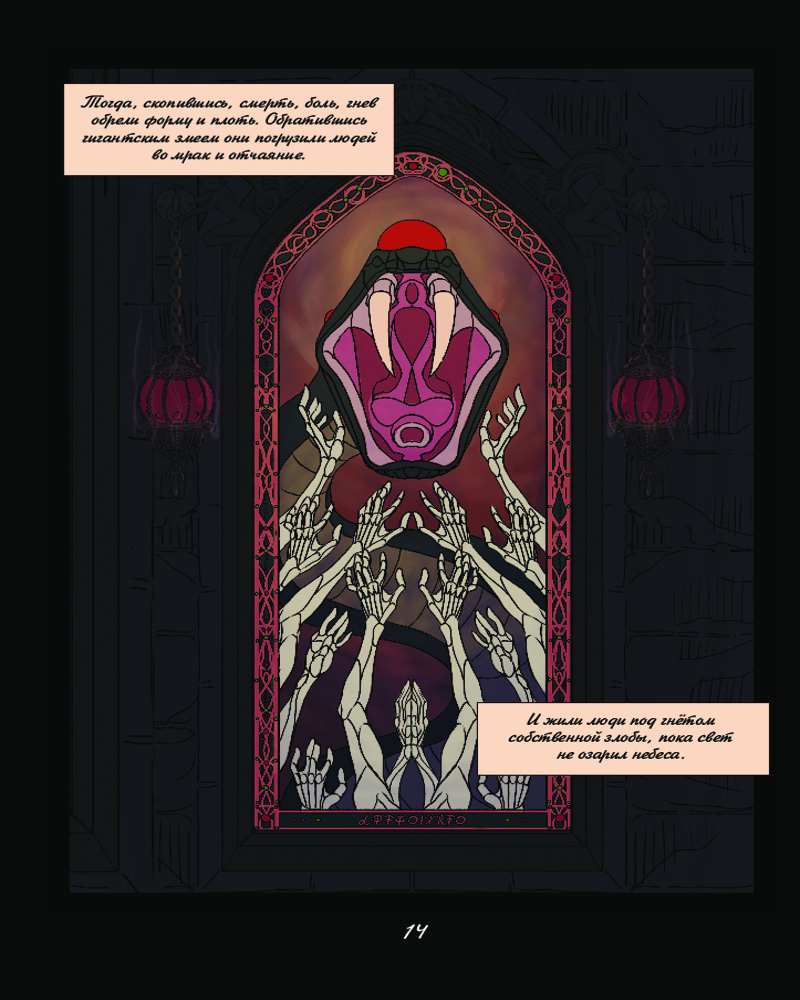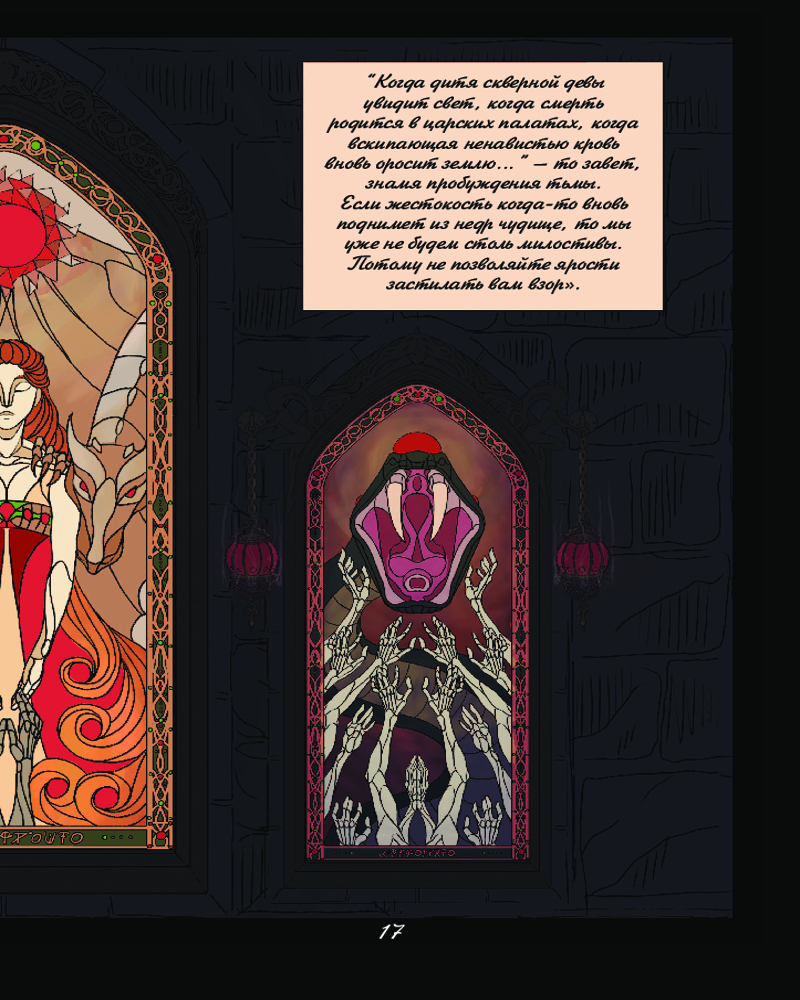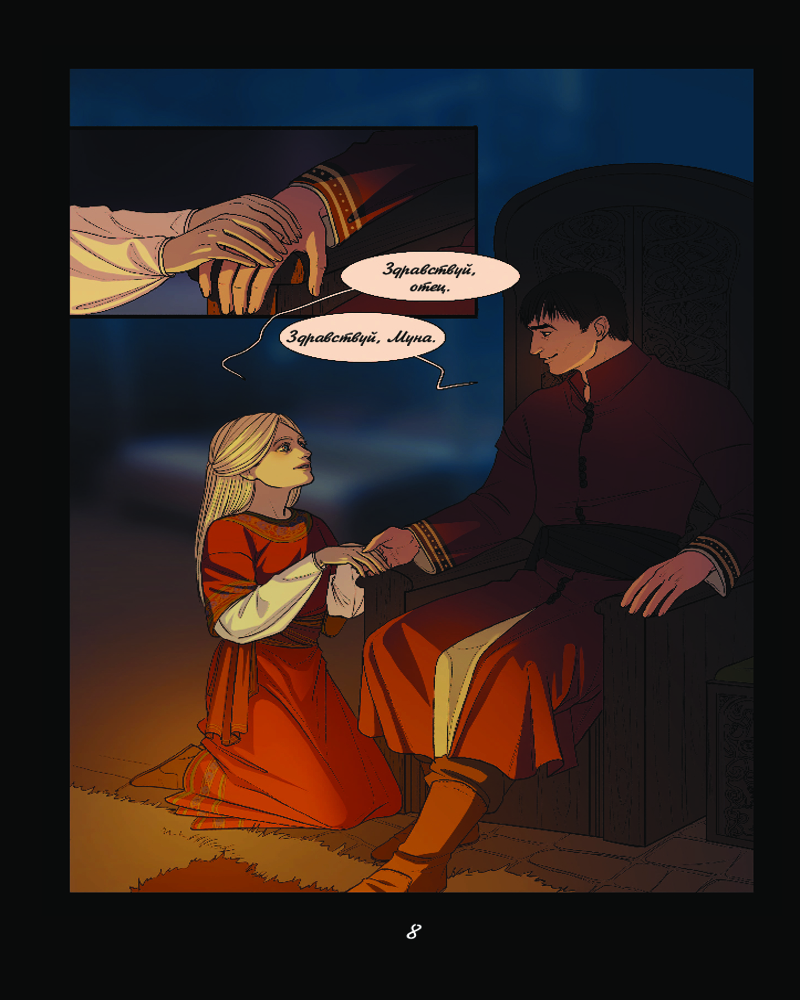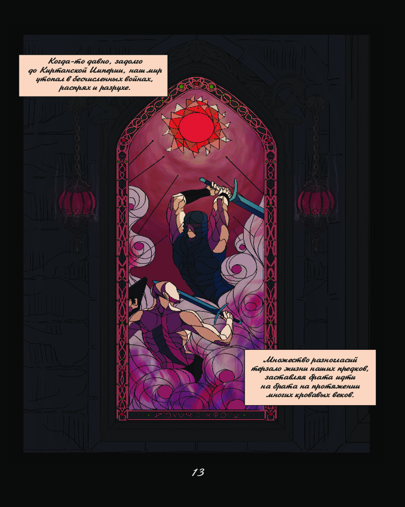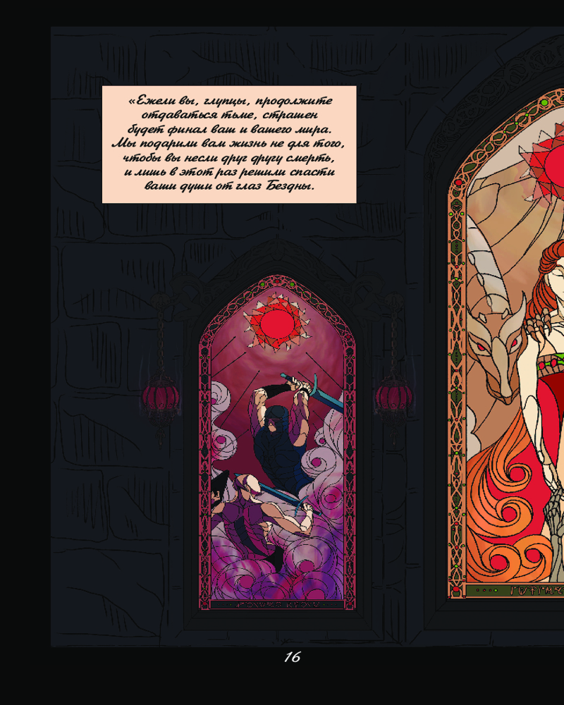 Серия: По ту сторону заколдованной реки. Комиксы в жанре фэнтези Когда-то люди были полны гнева и способны только на разрушение. Ненависть и боль, скопившиеся в их сердцах, пробудили ужасного монстра. Человечество погрузилось во мрак и отчаянье. Спасением стали Истинные Боги, которые подарили людям способность созидать. С тех пор прошло много лет, и люди вновь идут с мечом друг на друга. Человеческая жизнь снова начинает терять свою ценность, затмеваемая жаждой власти и богатств. Так, вступив в брак ради политического союза, Аири стойко переносит свою действительность, полную горестей и лишений. Однако, когда её семье на Юге требуется помощь, её муж, король Лэвбриса, Тенав, не торопится поддержать своих родственников и союзников.  |